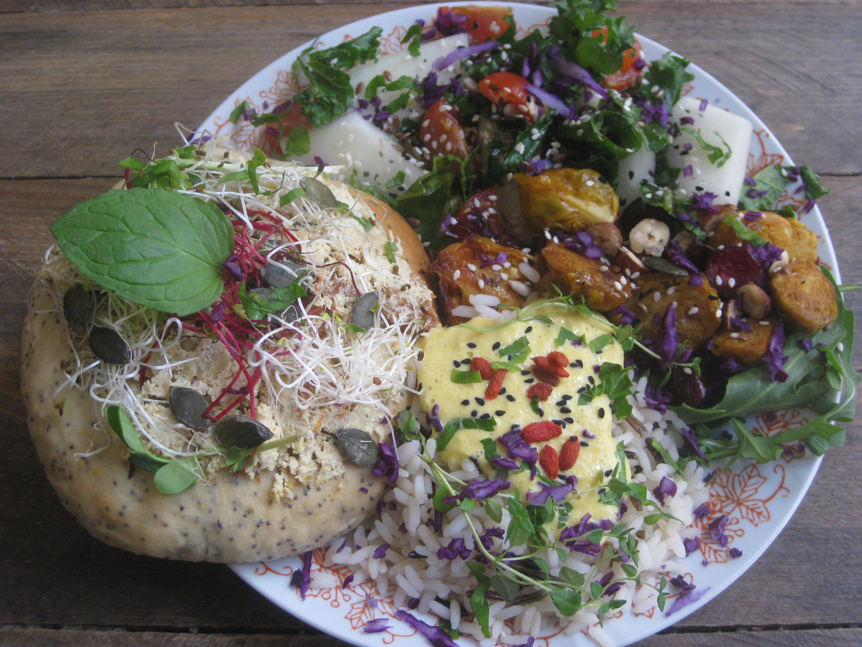 I was equally delighted with my dish (and bonus marks for pretty crockery).  I had a huge poppy seed bun, topped with a tasty, smoky spread.  It was served with rice under a creamy sauce, some Brussel sprouts, kale, cranberries, hazelnuts, cherry tomatoes and melon.  That sounds like a lot, but everything worked together really well and it was very balanced and delicious.