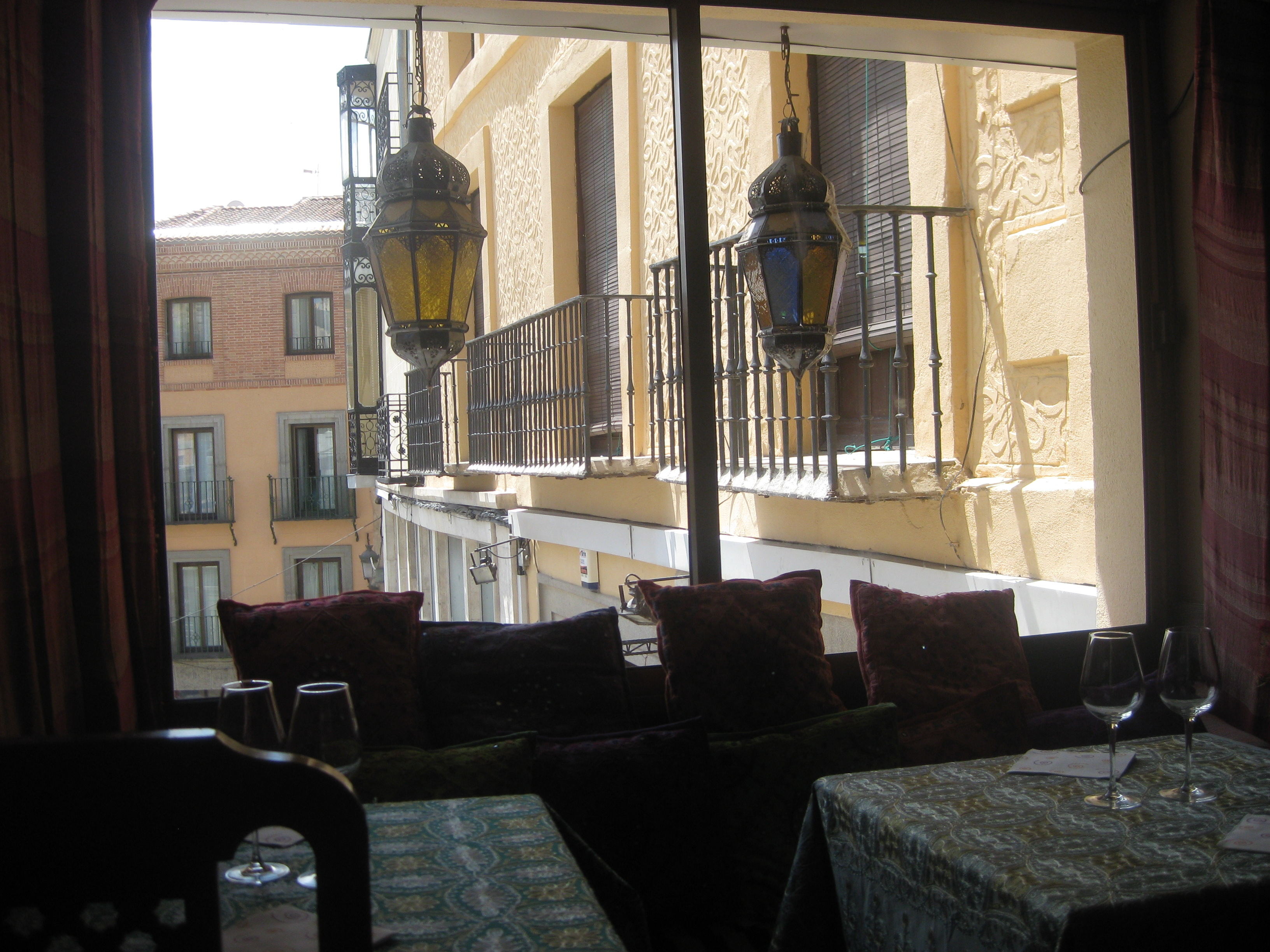 The decor has a Middle Eastern theme, as does the menu (though rather disgustingly, that includes the Segovia speciality, suckling pig, in schwarma form). The kitchen was just opening when we arrived at 1pm, and we were the only customers for most of the time, so we didn’t encounter any meaty dishes. There’s a vegetable couscous dish on the menu, but we decided to play it safe and get some hummus and falafel.