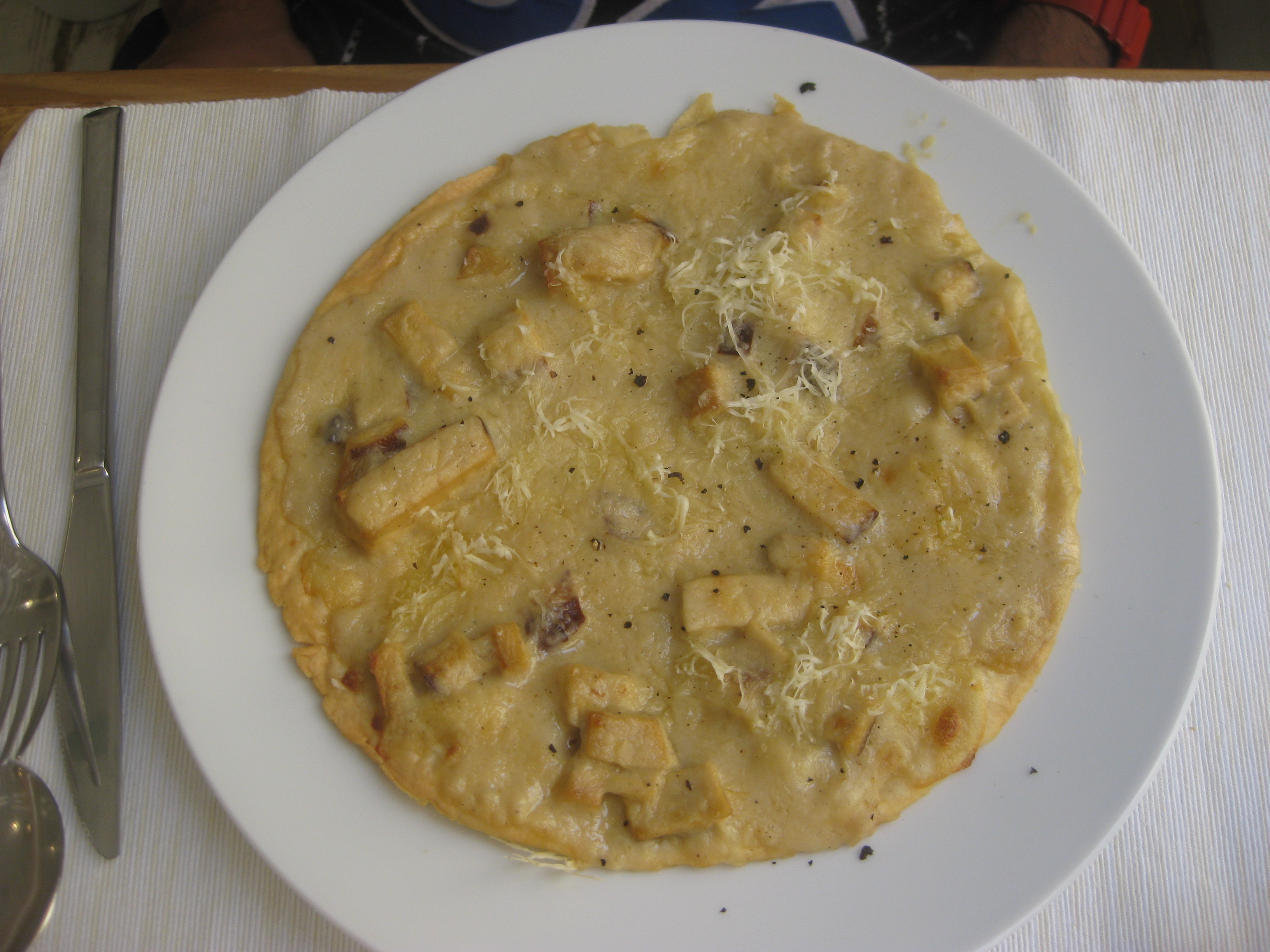 For the mains, Dr HH chose the pflammkuchen:  a kind of pizza with an extremely thin and crispy base, topped with a creamy concoction and a bit of cheese, and generously distributed bacon soy chunks.  He gobbled it up and said it was very good and salty.