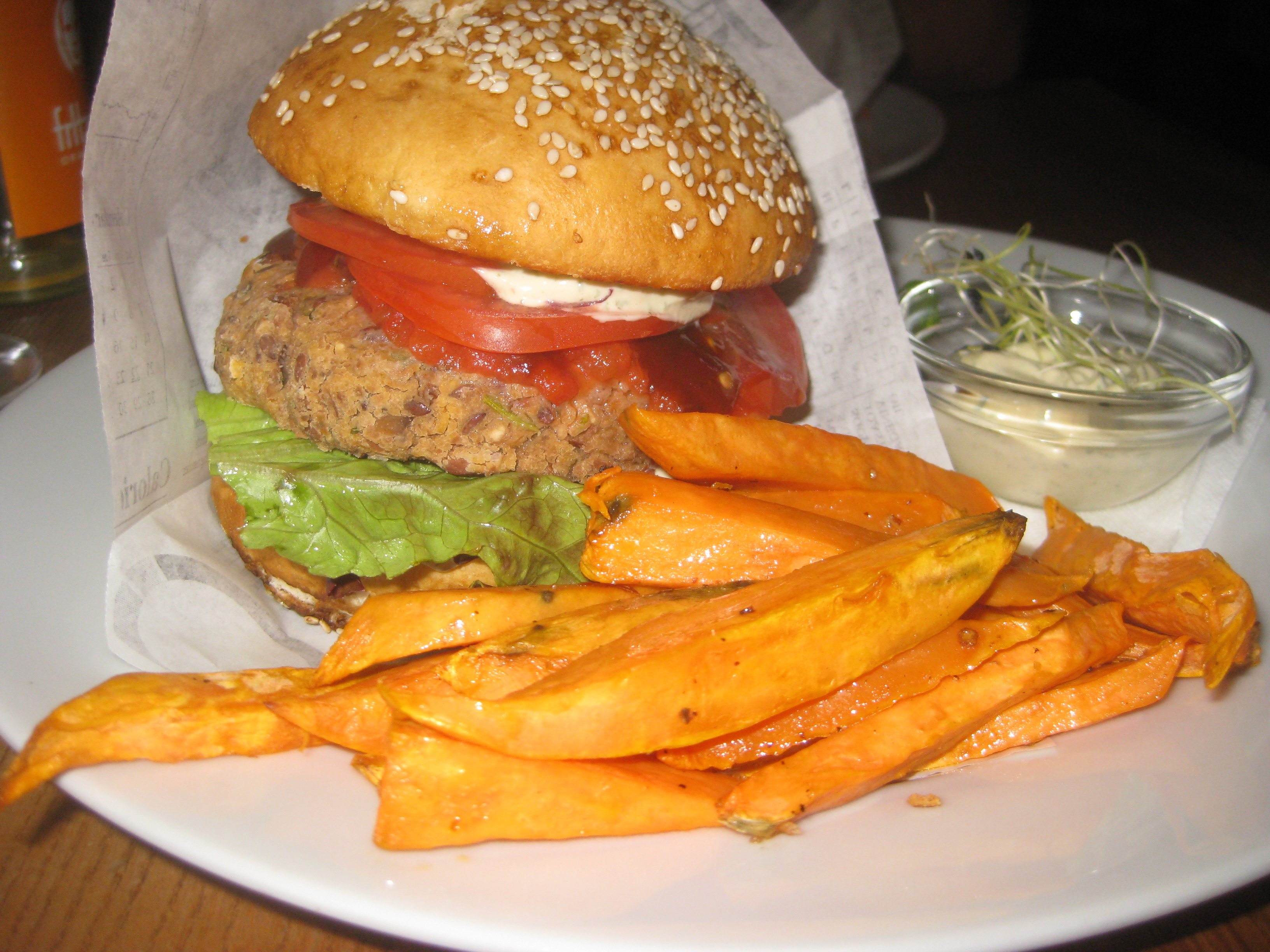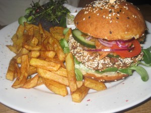 The menu changes quite regularly, and the online version didn’t quite match the one when we arrived. There were so many good options, it was really tricky to narrow it down! Eventually Dr HH and I both ordered burgers. His was a Thai burger with peanut sauce dripping down it. The patty was made of sweet potato and chickpea, and it was tasty but not really spicy, as you might expect from the “Thai” aspect.