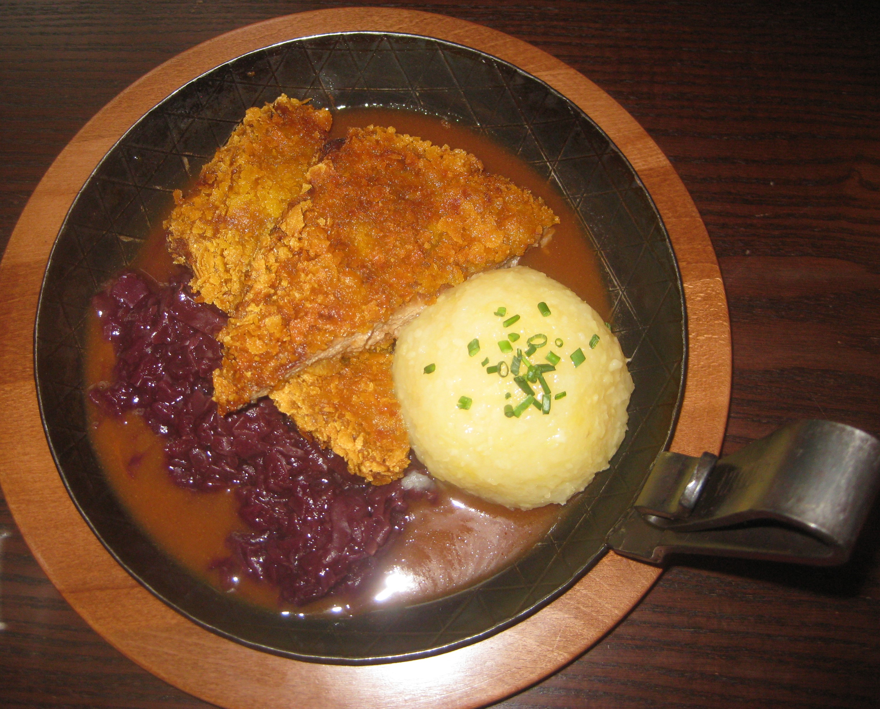 Dr HH went for the more varied Pfanderl plate, which he positively raved about.  It featured two huge, crispy, delicious slabs of soy steak, some kind of huge potato dumpling, lots of red cabbage and a rich, sharp beery sauce.  He was very pleased with his choice.  As you can see, this was also a huge portion.