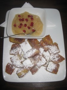 There are a few desserts on the menu, and we opted to share the Kaiserschmarrn (if you’re planning a visit, please note that it takes 20 minutes to prepare).  This was a real treat, and even though we were already pretty full, it was not the kind of dish we could abandon.  It is essentially a pancake with raisins and almonds in it, torn into pieces, deep-fried, sprinkled with icing sugar and served with a pot of apple sauce.  If that doesn’t tempt you, then what kind of monster are you?!  I would definitely recommend sharing this – it was hearty.