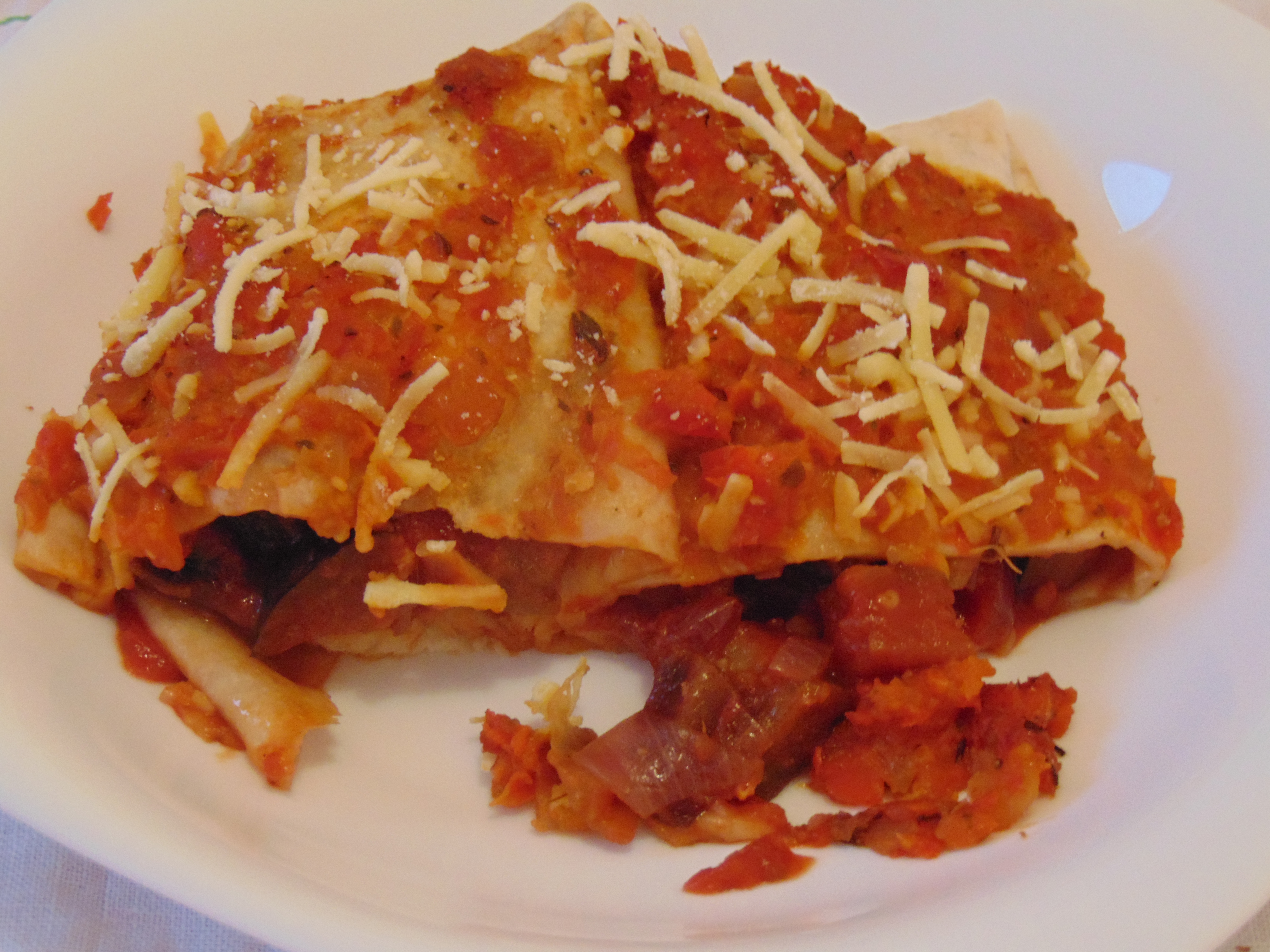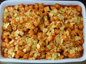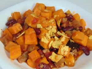 This aubergine and sweet potato casserole looked really inviting, with the vivid orange sweet potato layer. And it tasted really great too – there’s some mince in there along with all the aubergine. Dr HH said he would have preferred the tortilla chips served on the side for dipping, rather than letting them get soggy on top, and I can definitely see his point.