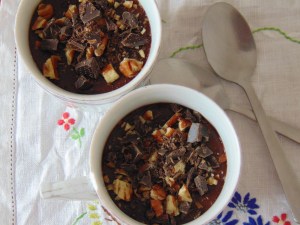 Mmm, chocolate and pecan pots! This is a dessert recipe that I didn’t turn into breakfast food. The recipe suggests making these in a bain marie, but this proved impossible for me: the mixture didn’t get hot enough to boil and thicken. When I put the milky mixture directly in a pan, it worked a treat. The pudding itself is similar to those little Alpro chocolate puddings, which was nice. I’d add a bit of chilli next time to make it stand out a bit more!