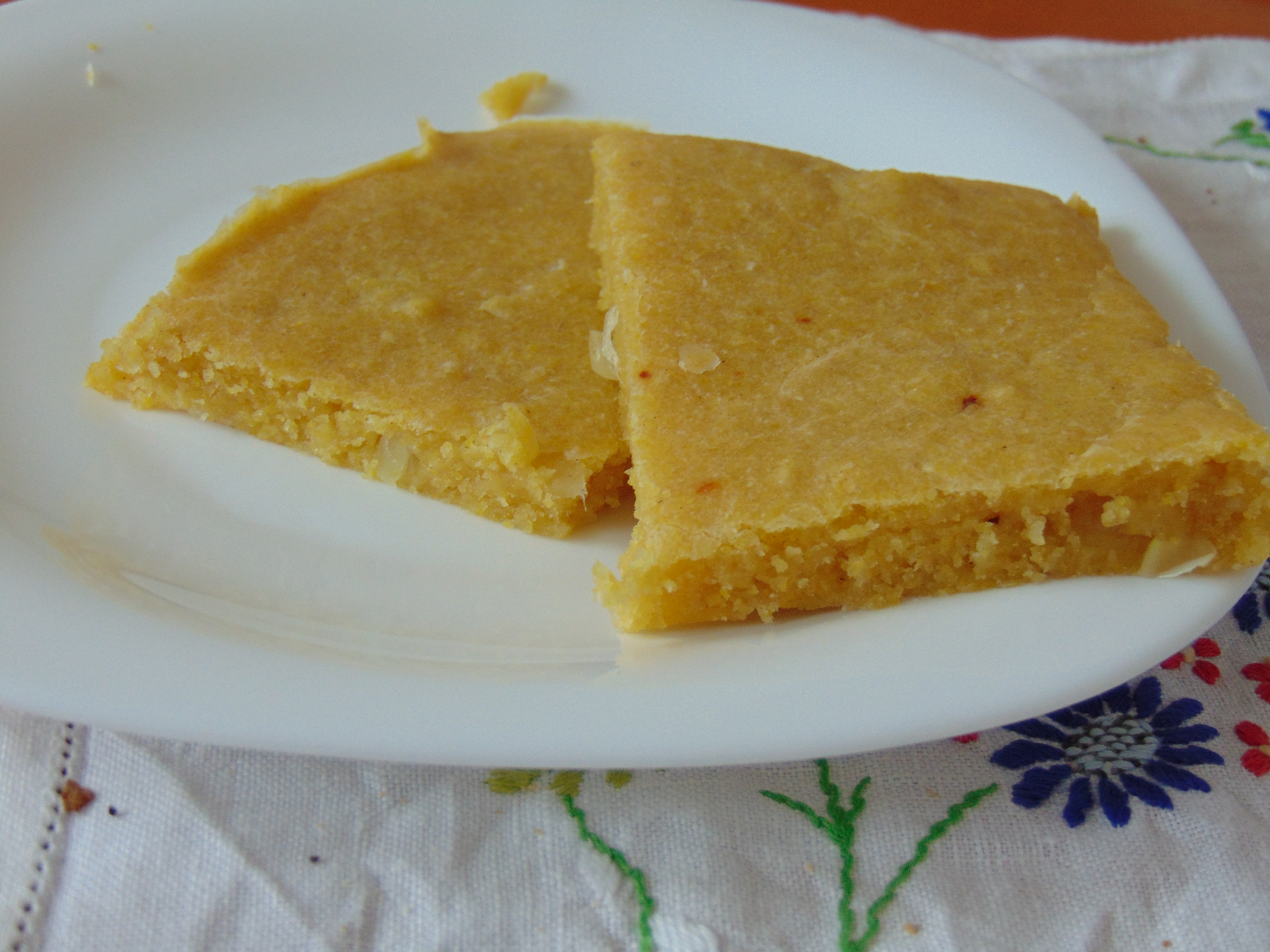 And I served it with some cornbread, which I’d never made before. I encountered two problems, both of which were my fault rather than the recipe’s. 1) Just as I was popping it in the oven, I realised that I had just used plain flour without adding a raising agent (the recipe called for self-raising flour, but I just wasn’t thinking). 2) I only have one oven-proof dish and it’s very big, so the mixture only thinly covered the base. Put these two things together, and you can see why the end product is so flat. Still, it had a nice spongy texture and was really nice, so I’d definitely try this again and pay more attention!