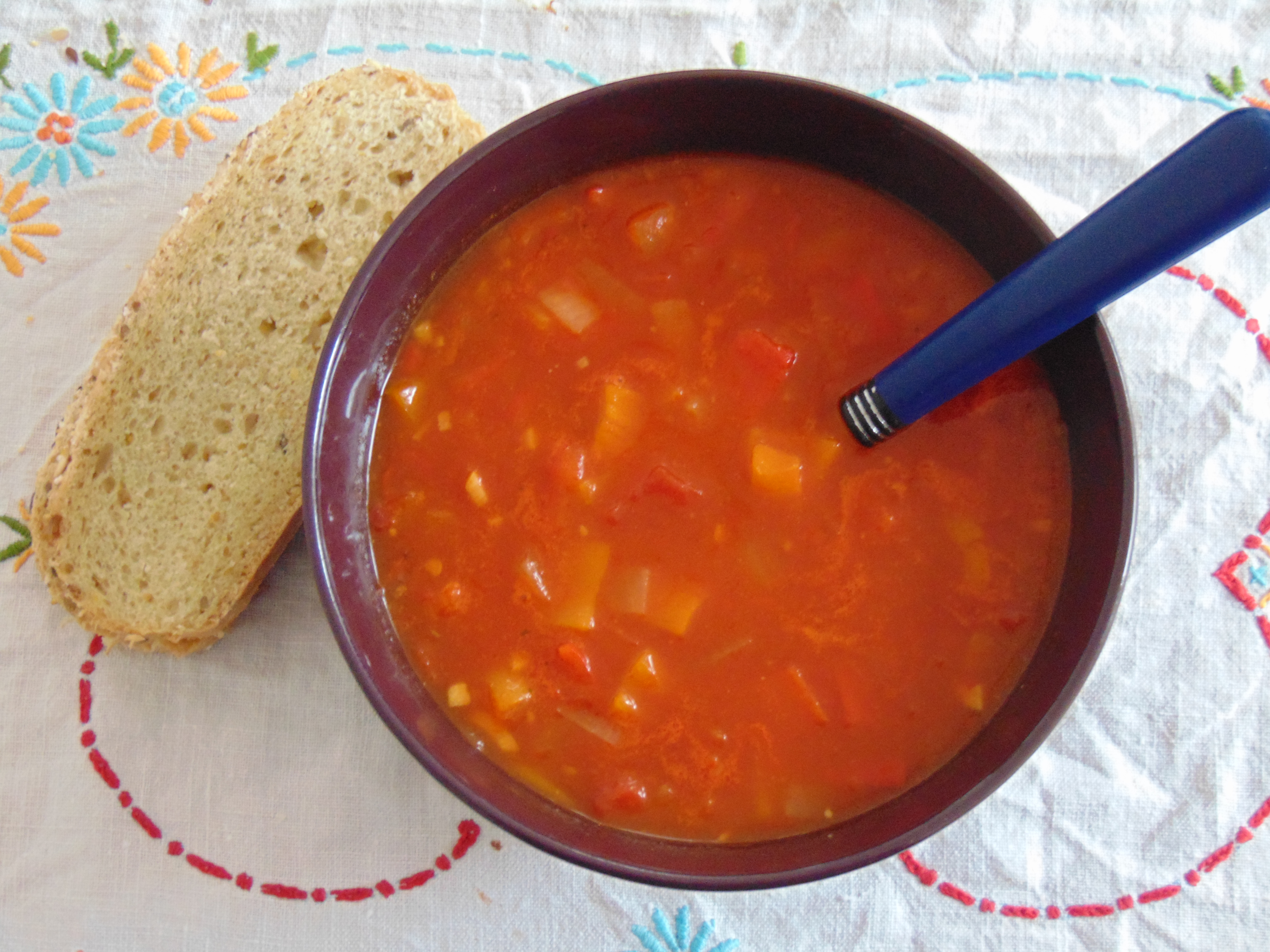 I tweaked the sweet pepper, tomato and orange soup a wee bit – I roasted the peppers first, because who doesn’t prefer roasted peppers? I also used a tin of chopped tomatoes rather than fresh ones, and added some stock, as there was none in the recipe (presumably a mistake). It was such a great soup – really attractive colours, filling, with a lovely sweetness from the peppers and a healthy chilli kick. I’ll definitely make this again.