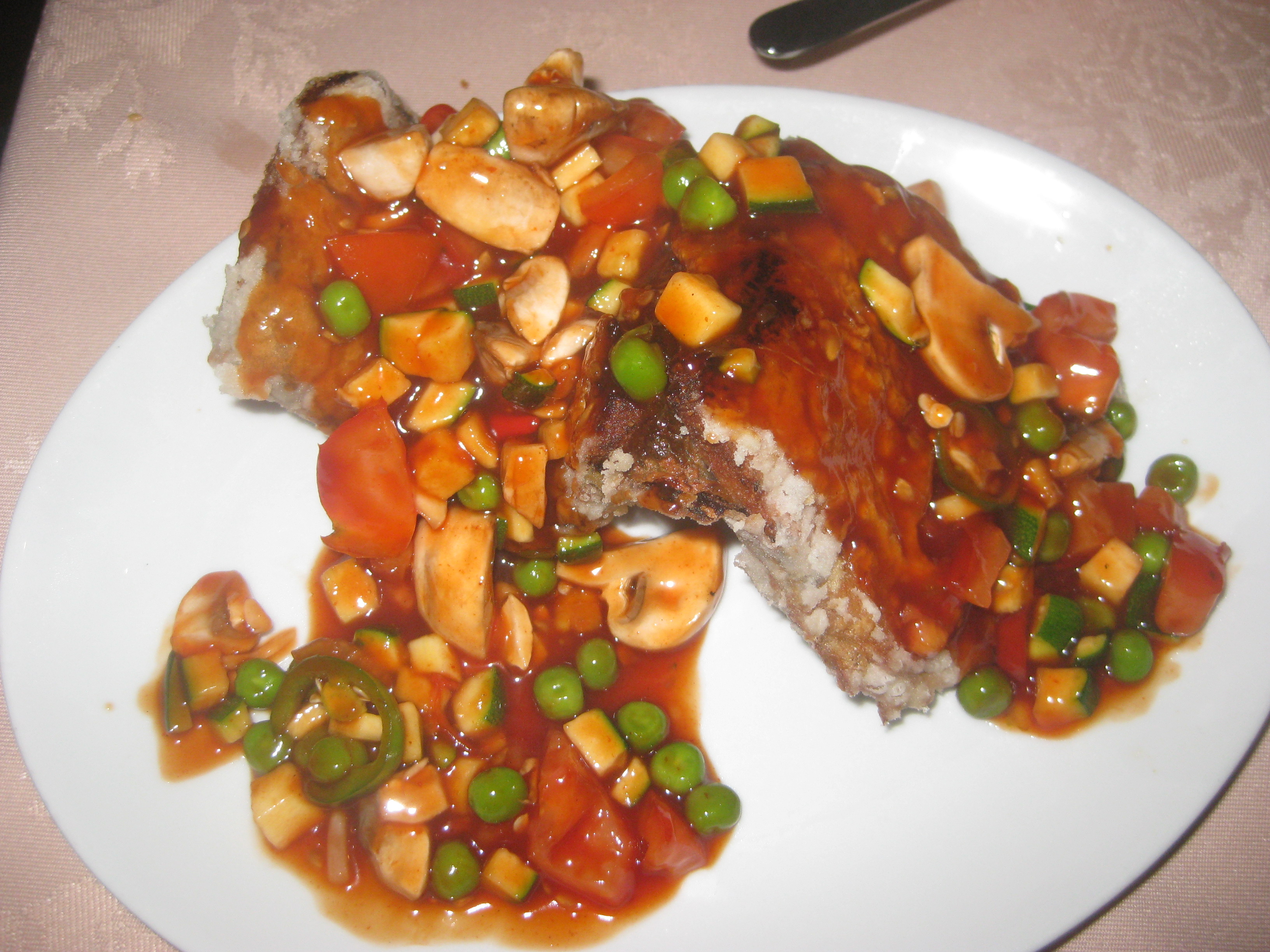 Dr HH has no such fears, of course:  this is the very exciting looking Assam fish. When I asked him for his review, he raved, “It was so flaky, like fish!  I loved the crispy skin, like real fish!  Look at the presentation, all wavy!  The sauce was so spicy!”  I can’t really build on that enthusiastic review (all exclamation marks his own).
