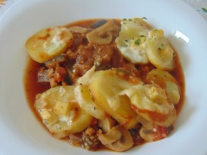 Of course I had to try the moussaka. I used a tin of tomatoes rather than fresh ones, and used feto cheese on top, but otherwise followed the recipe. The dish was really flavoursome and the aubergine cooked beautifully. Alas, the potato slices were a touch too hard – I always find it difficult to balance the thinness with the appropriate cooking time, they always end up either mushy or underdone. Still, I’d recommend it.
