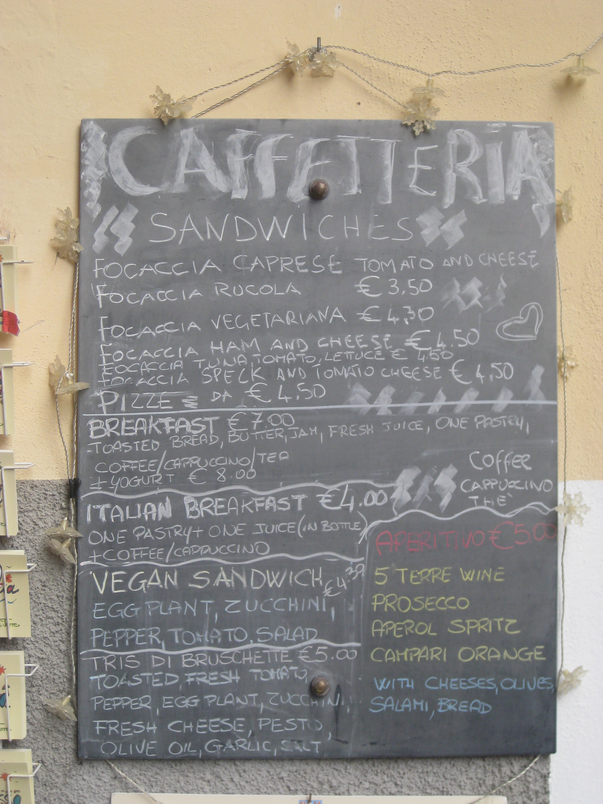 After a short train ride and a long climb up 365 stairs from the station to the village proper, we were devastated to arrive at 0km and find that they had nothing vegan at all.  Fortunately, just a few doors down, we spotted this sign outside Pan e Vin. A great vegan victory!