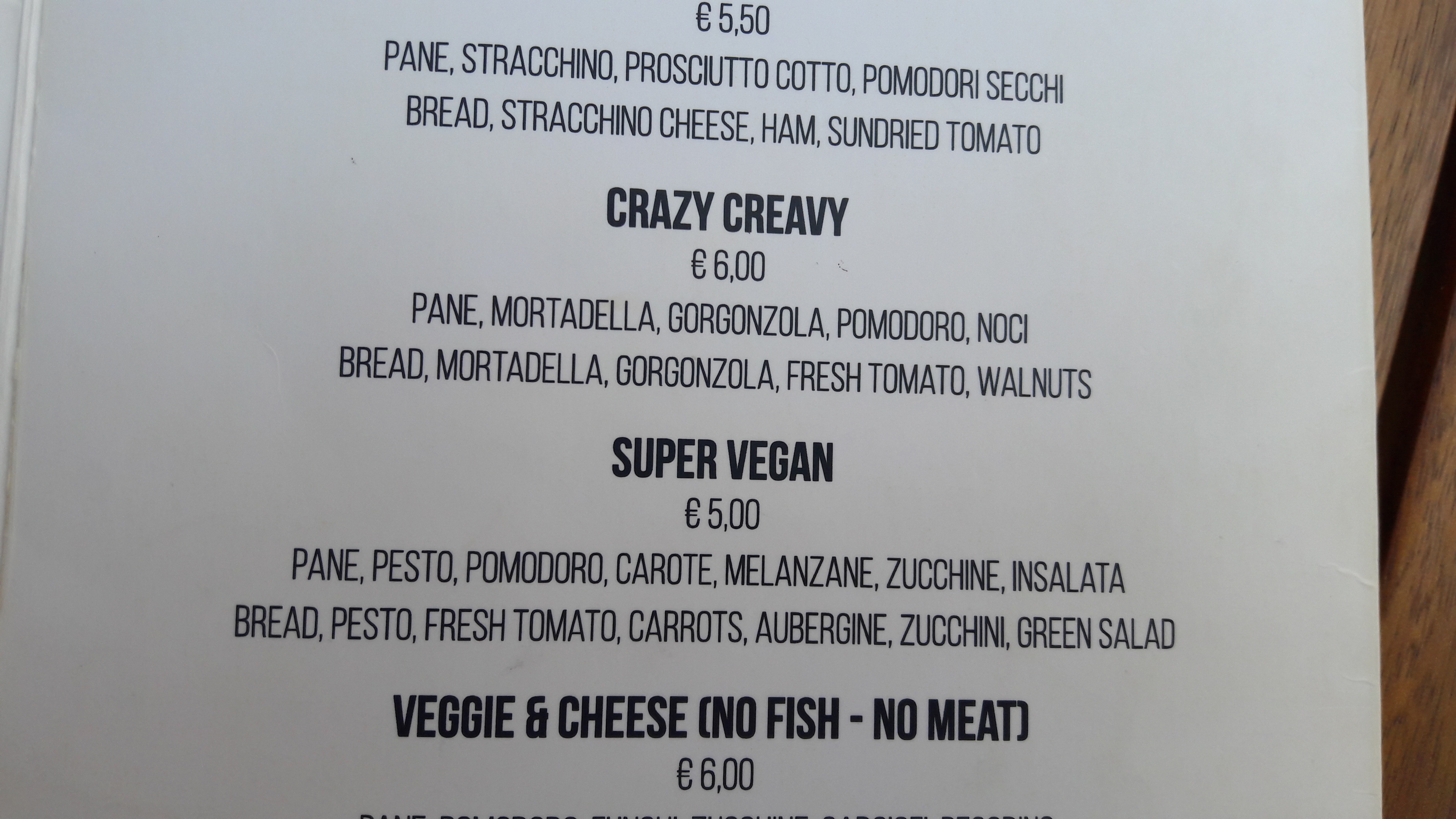 Lunch Box in Vernazza is another of the few places with advertised and labelled vegan options.  You can probably get some classic marinara pizza (just with tomato sauce) or spaghetti with tomato and basil pretty much anywhere, but if you want certified vegan food you seem to be limited to a few sandwiches and a reasonable amount of gelato.  Not too shabby if you’re only there for a few days and not exerting yourself on the trails.