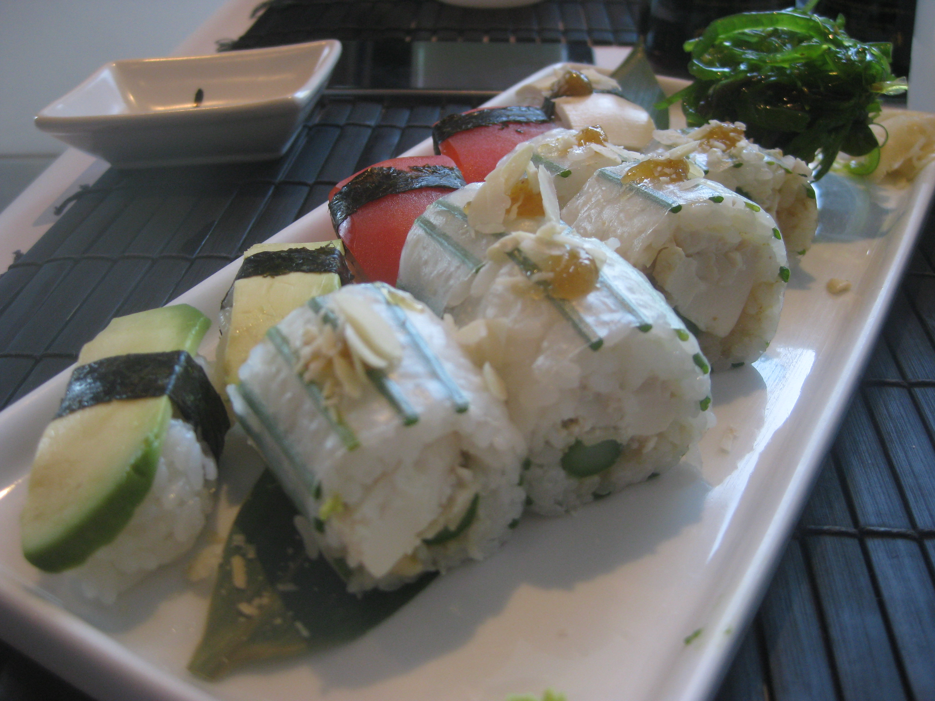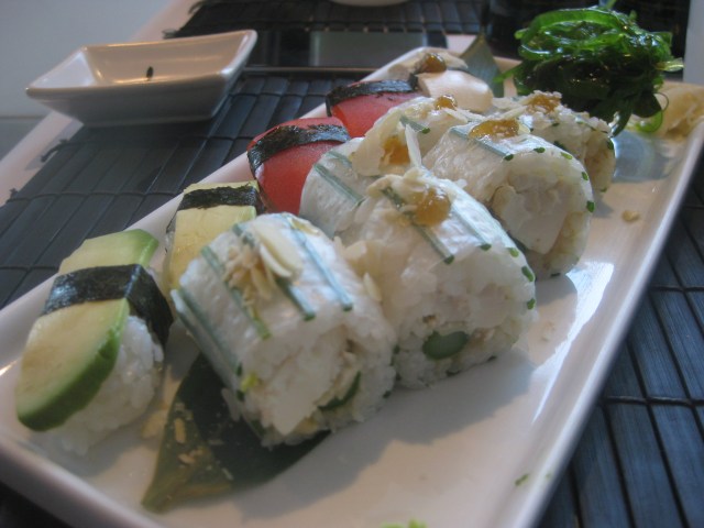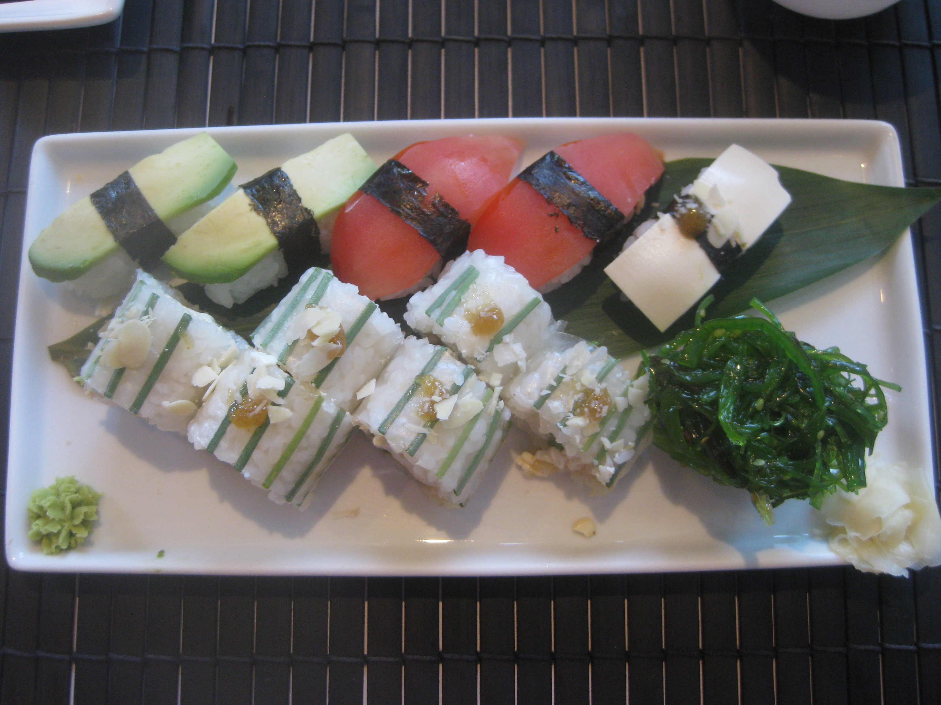 The brunch set itself came next. There were two pieces topped with tomato, which were unsurprisingly a bit boring. The two with avocado were better, and there was another delicious one topped with some tofu and fig jam. There was one topped with an actual mountain of wakame, and six little rolls striped with chives, filled with tofu, asparagus and fig jam, and topped with flaked almonds. They were the most exciting, and the most delicious.