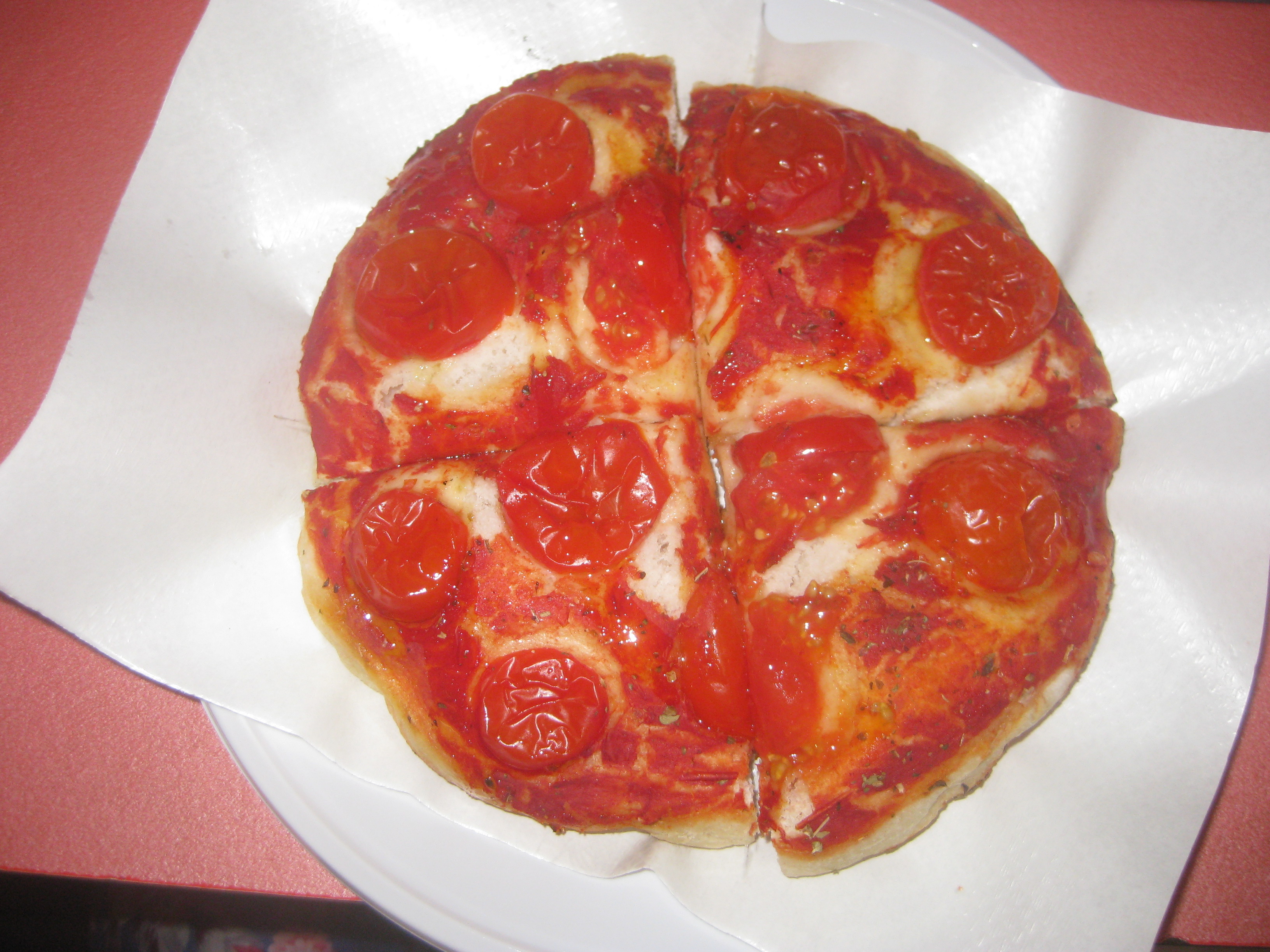 He pointed to this tomato bread and a similar olive-topped one. Hurrah! It was a good deep dish bread which he warmed up for me, topped with flavoursome tomatoes and a hearty drizzle of oil. It was just what I needed!