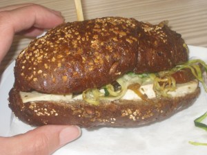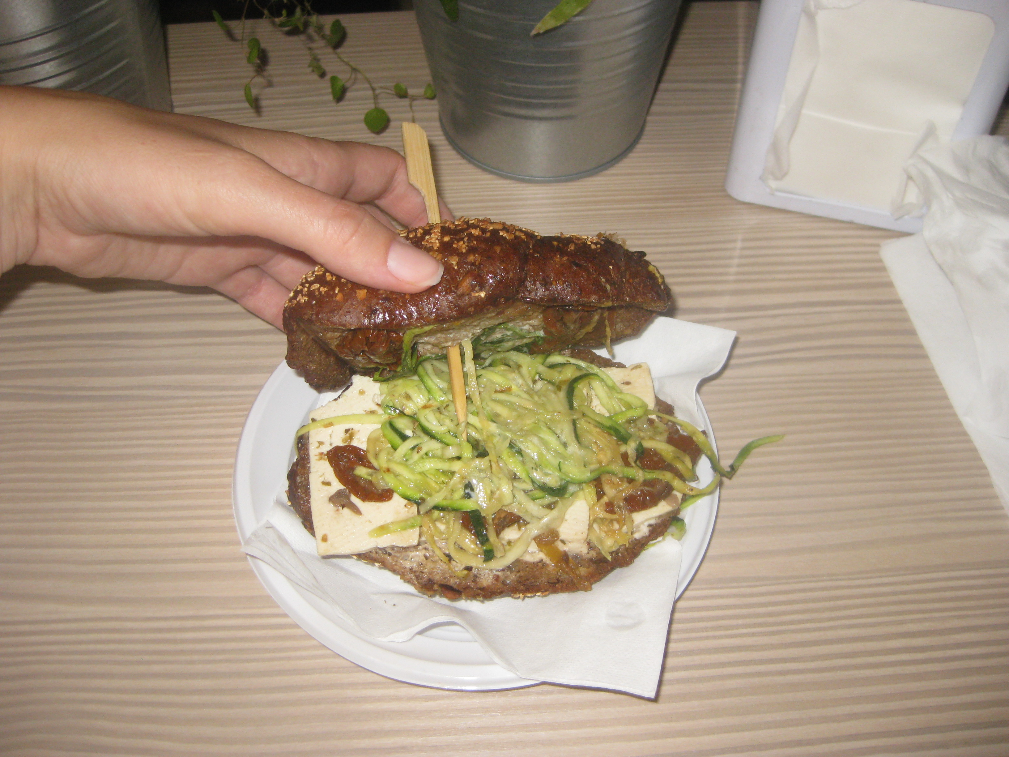 I got this dark brown toasted bun filled with slabs of tofu, sun-dried tomatoes and strips of courgette.  It was good!  Don’t sun-dried tomatoes just make everything better?!