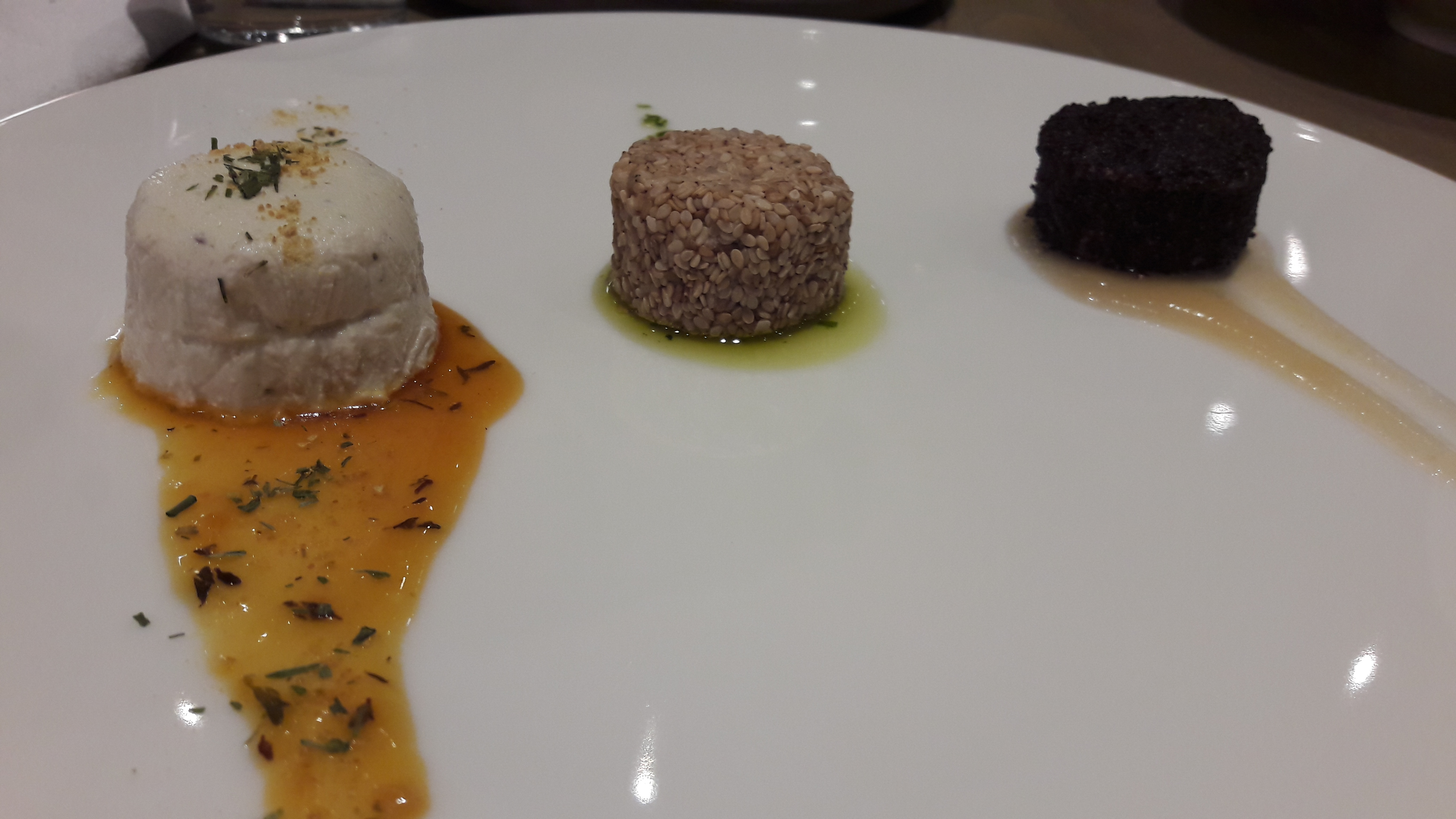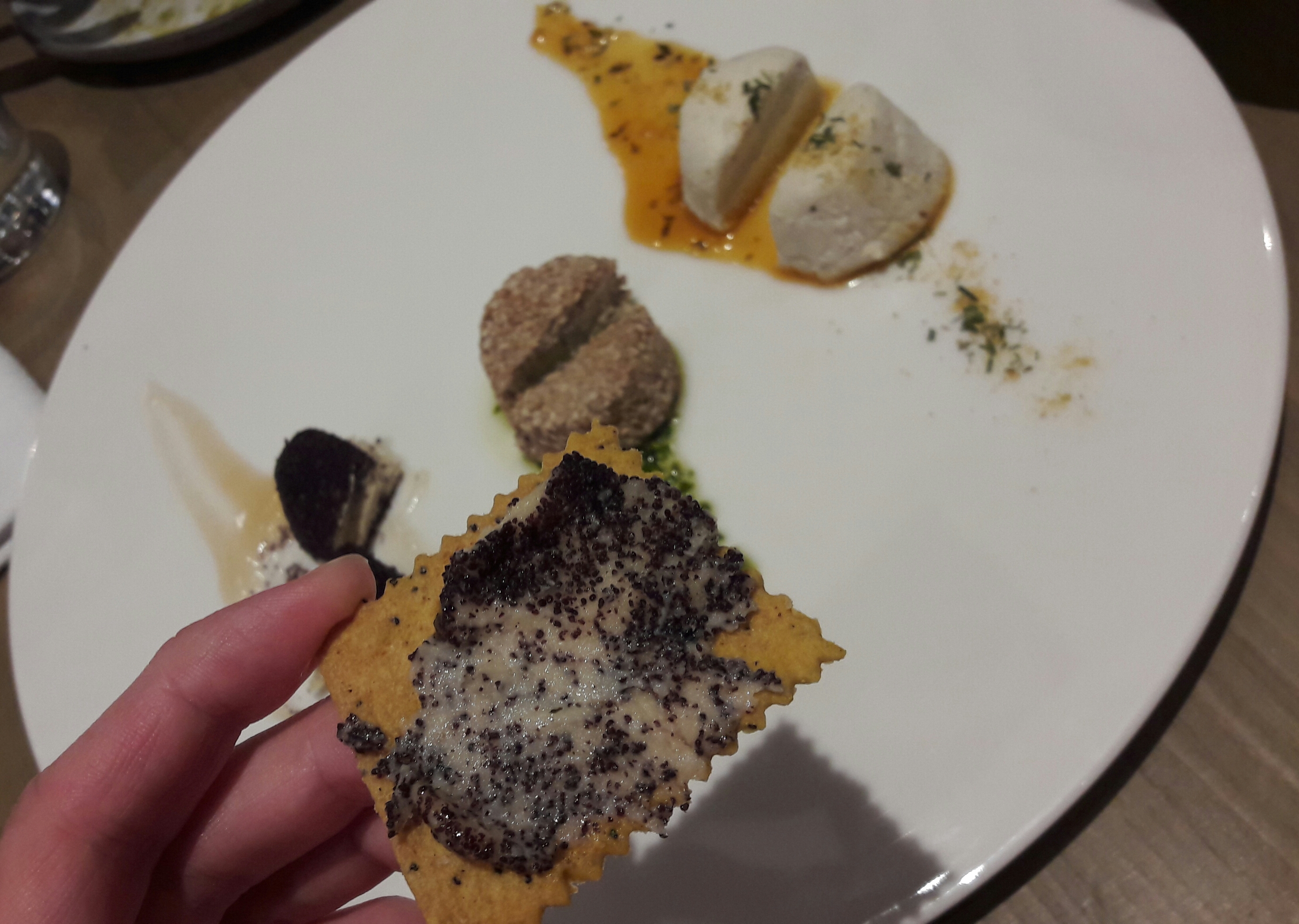 There were three cheeses, from left to right: almond ricotta on citrus jam (beautifully creamy and light); cashew cheese with black olives in sesame seeds, on pesto (so flavoursome); and cashew cheese with poppy seeds, on apricot jam (I loved that poppy seed coating!). The portions were tiny, and it cost €14, but it was so lovely I would be happy to have it again for a splurge.