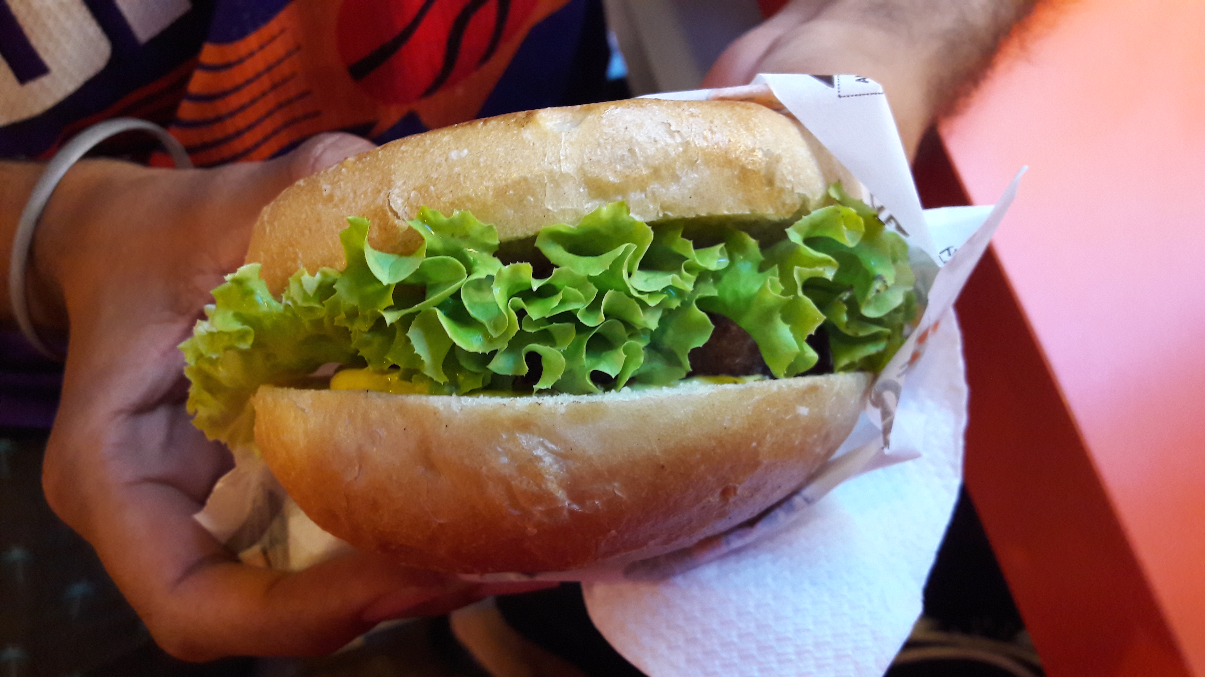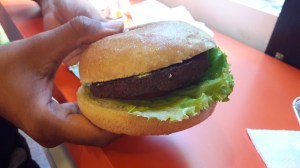 We both got the vegan burger, which didn’t look quite as grand as in the advertising. But it was a good seitan patty, which we weren’t really expecting from a generic, omni fast food place. We also had a choice of condiments, including vegan mayo. Top marks.