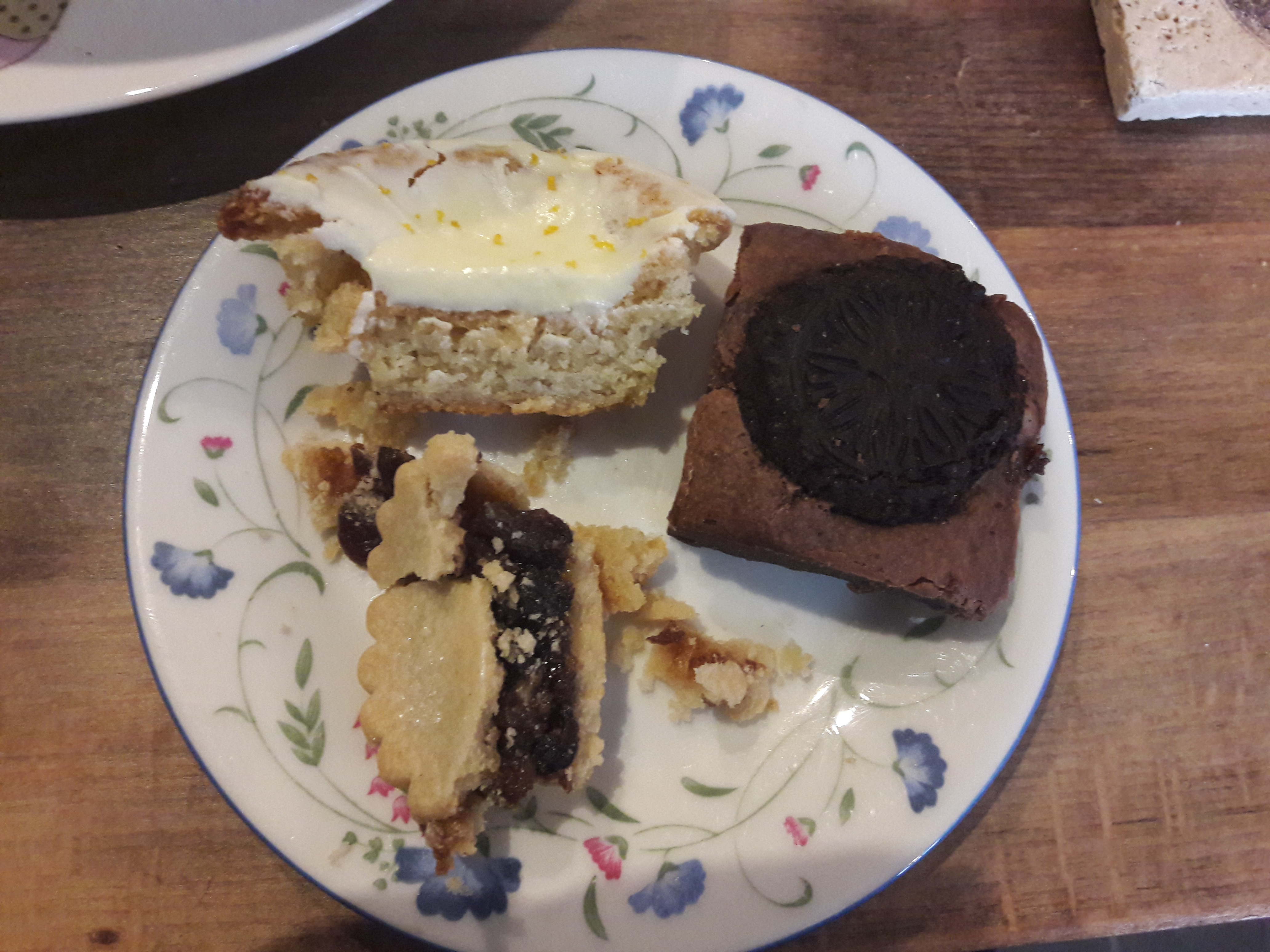 On to the sweet treats!  Actually, this plate was a little less festive, but the mince pie means that it still counts towards the MiniMoFo festive baking theme.  Dr HH found the pie a little sweet, but I loved it – the pastry was especially good.  The lemon drizzle cake was extraordinary!  It had almost a pie-like crust on it which contrasted beautifully with the creamy icing and soft, zingy sponge.  The brownie was meant to be chocolate orange, but turned out to be Oreo – less Christmassy, but no less delicious!
