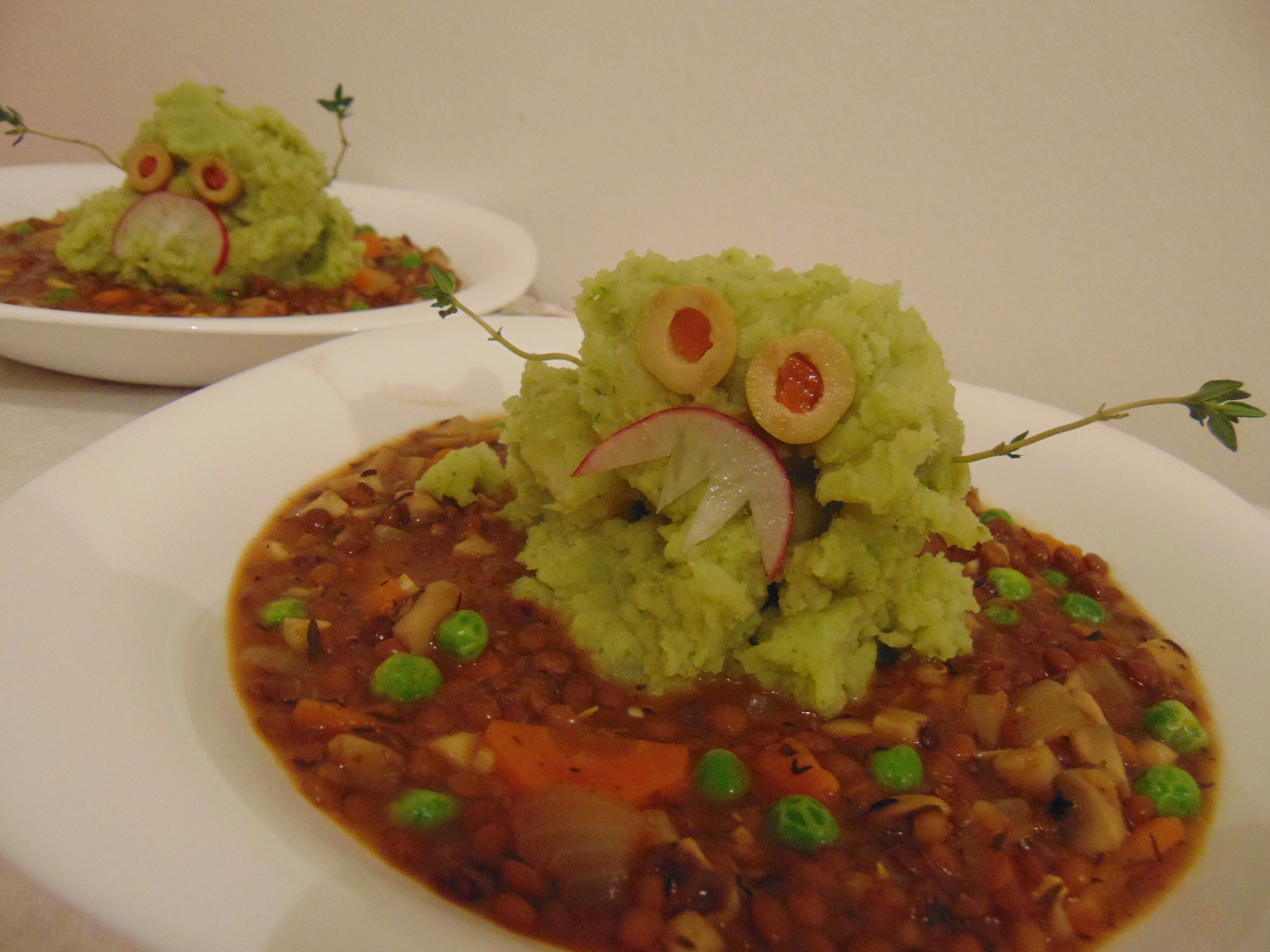 I couldn’t resist this monster mash shepherd’s pie! It’s a pretty standard Isa shepherd’s pie, which is to say it’s delicious, but this time it’s topped with a coriandery mash. I wasn’t convinced coriander would work with the more traditional filling ingredients, but it was a very exciting combination and definitely worth trying! After serving these monster portions, I used the rest of the filling and mash to make a normal shepherd’s pie to be warmed in the oven, which was also delicious, if less fun visually.