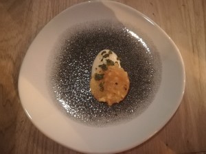 The amuse bouche was described to us as golden beetroot with pickled beetroot: a delicate, deep-fried slice with a soft puree.  This tasted like pickled onion Monster Munch, which is to say that it was delicious.