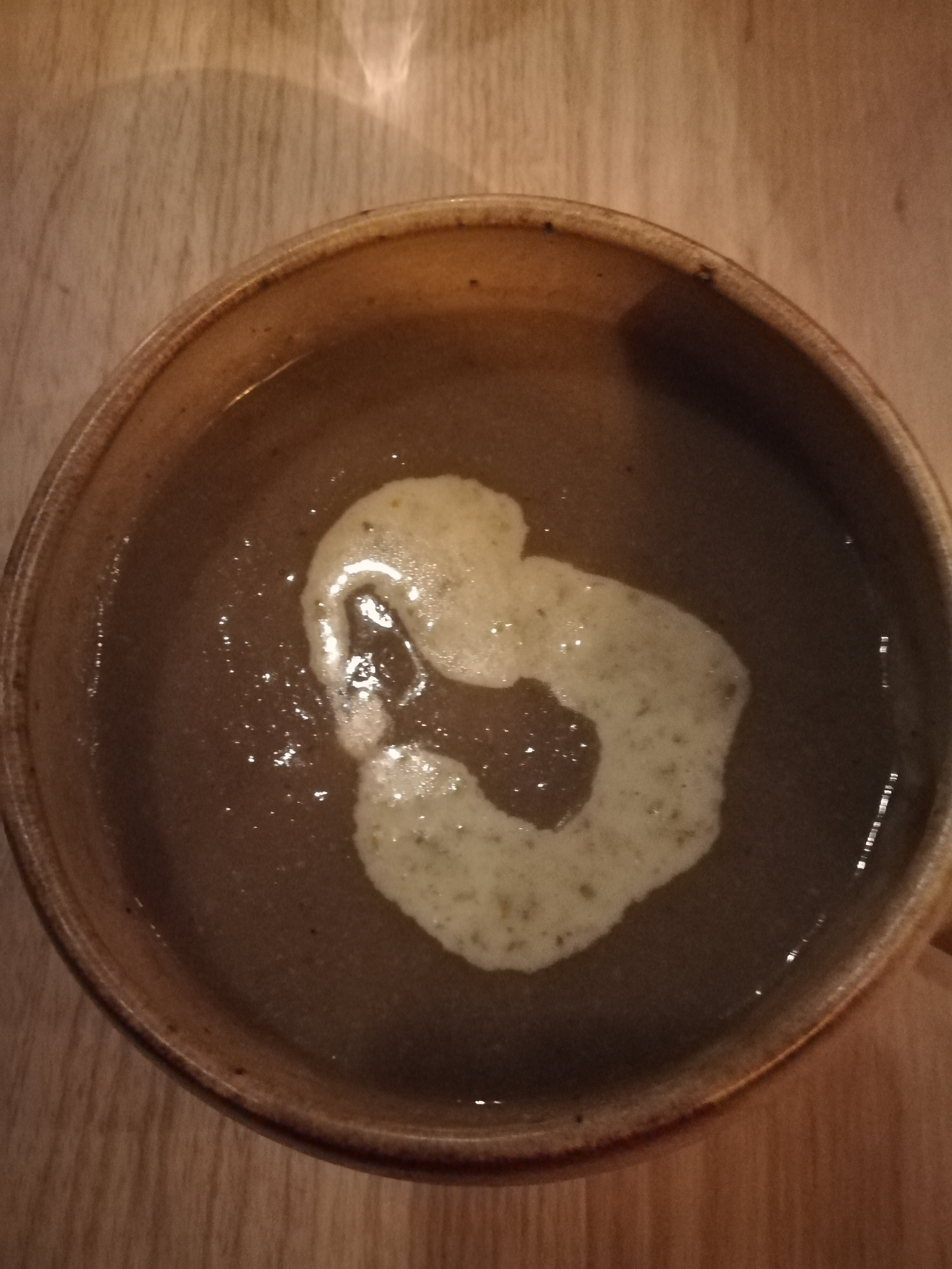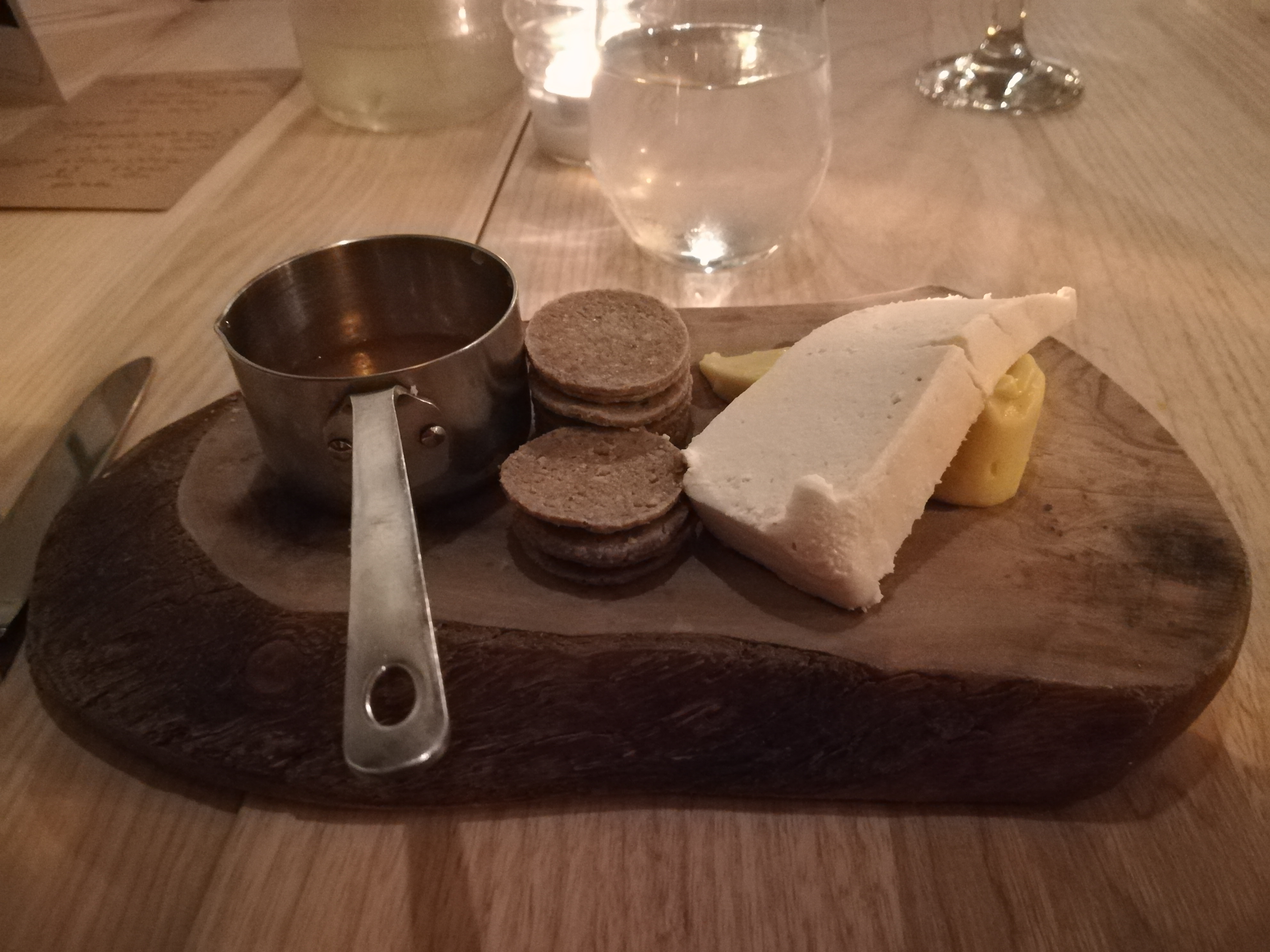 And here’s the cheeseboard, which we were really looking forward to.  We got a little pot of apple chutney, a stack of crackers (which was replenished as needed), and two cheeses:  one of them turmeric, the other coconut.  I thought the coconut one was delicious, though Dr HH favoured turmeric.  They were really similar textures, which was a little disappointing – I’ve seen the excellent variety they produce on Instagram, and I was hoping we’d get a couple of really different things.