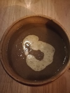 They were offering a seven course Christmas menu for £40 per person, or a ten course extravaganza for £55.  Mama HH very generously treated us to the latter, and we will be eternally grateful because it was just amazing.  I will say right away that the lighting is not conducive to great photography, so apologies for the gloomy pictures – but at least they’ll give you some idea of the treats we devoured.