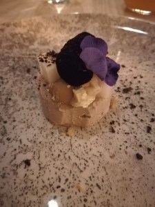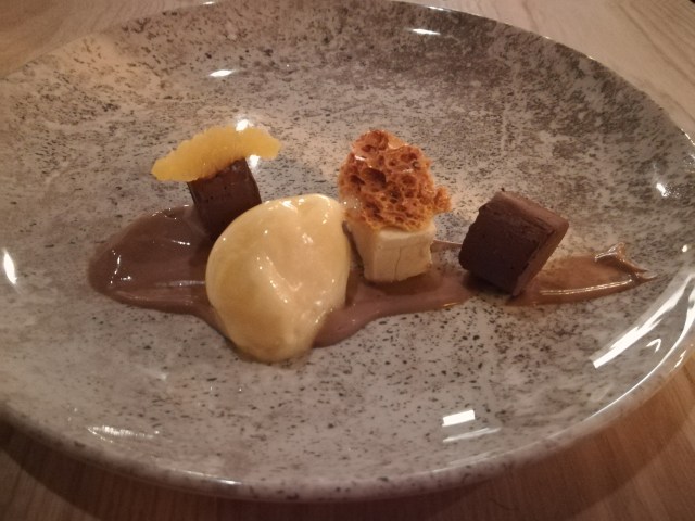 But here is the dessert itself.  Regular readers will not be surprised to learn that this was my favourite course. There was an orange sorbet that wasn’t bitter at all (it can be a fine line with orange, in my experience).  There were two little cylinders of chocolate truffle, and I’m going to say something unexpected here: one would have been enough for me. On top of all that was some honeycomb and a little nougatty cube.  This dessert was very rich and decadent, and I loved the festive chocolate orange flavour.  Sublime!