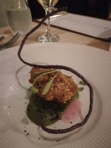 Ah, the cauliflower course!  Why don’t more restaurants offer this? The sesame-fried cauliflower was incredible – really crisp on the outside, tender on the inside, and the sesame seeds in the batter were a wonderful touch.  It was served with pistachio and lemongrass custard, pickled chilli candy beetroot, and a kale crisp, which I guess is the big twisty thing?  Everything tasted so good.