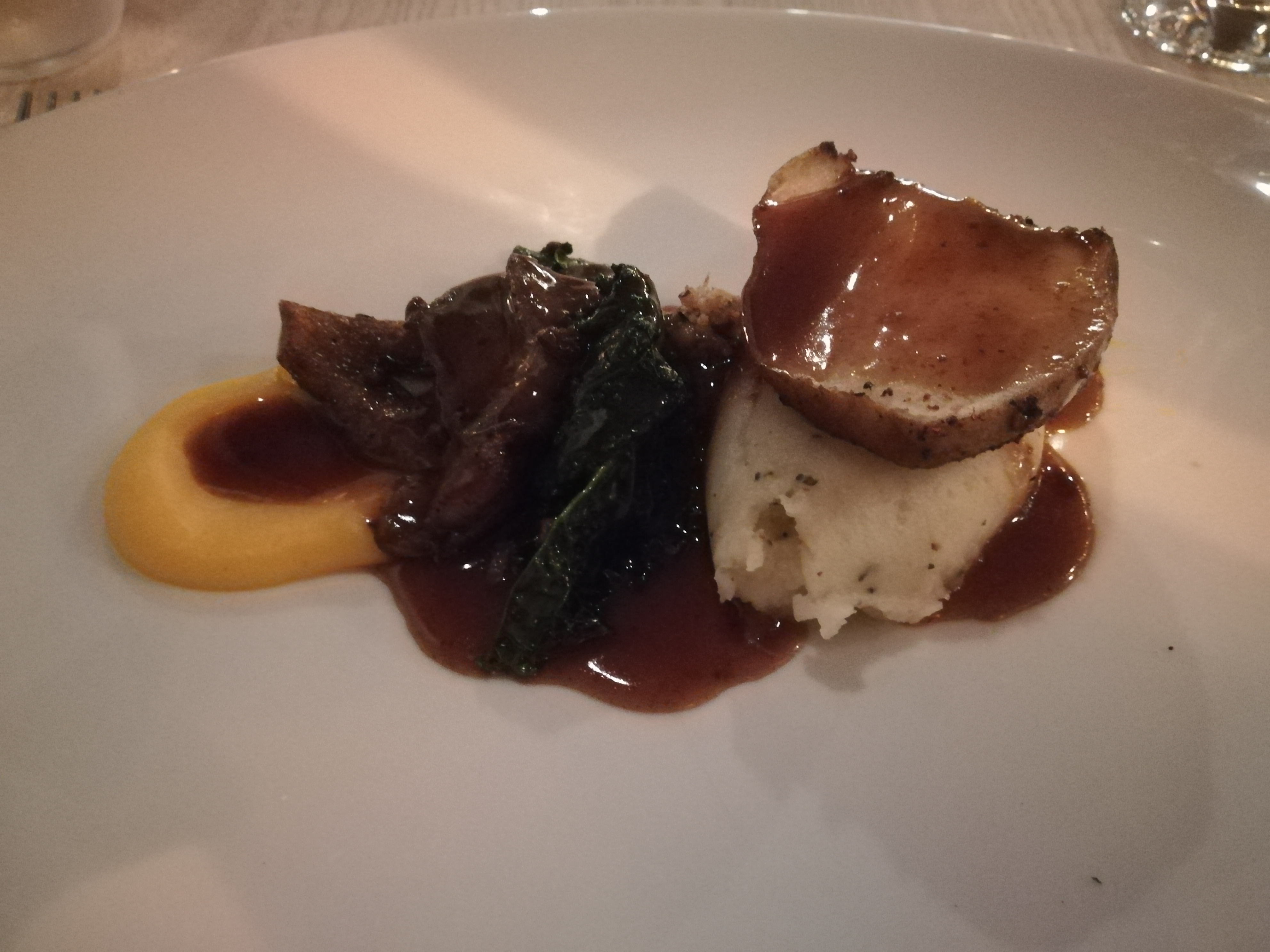 I was already pretty full by the time we got to the main course! (Let the record show that Dr HH was not.)  There was confit aubergine, which was incredibly soft, and a delicious gravy.  There was also some mash, cavolo nero, and oyster mushrooms.  Dr HH declared this his favourite course, and I agree that it was delicious – but for me, the best was yet to come!