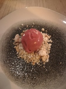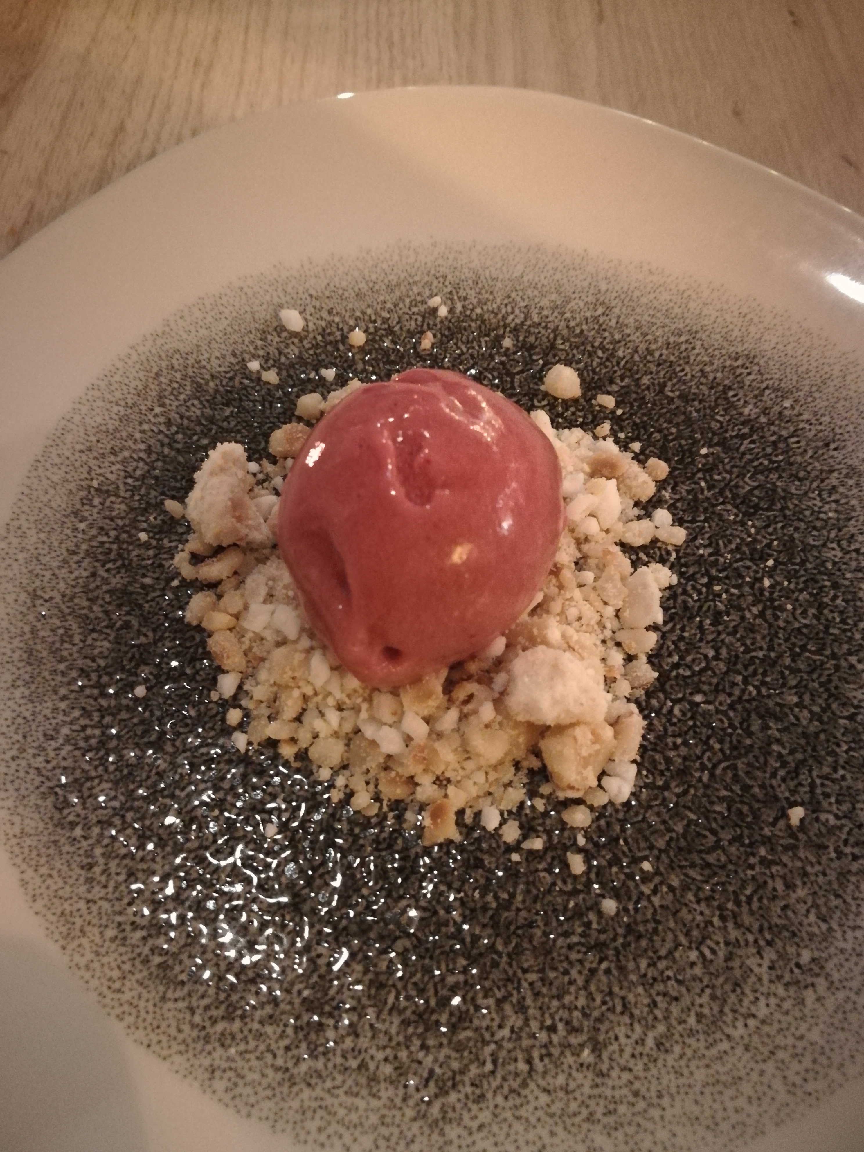 Pre-dessert is such a great idea, and this one was wonderful: raspberry sorbet on top of chopped caramelised hazelnuts. The sorbet was really refreshing, and the hazelnuts almost elevated it to actual dessert standard!