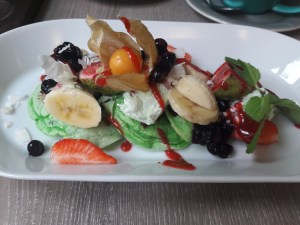 The breakfast menu is also quite tempting – there are about five items written up on the chalkboard, though when we went two of them weren’t available. Fortunately I already had my heart set on the pandan pancakes, which turned out to be one of the most visually appealing dishes I’ve ever been served!