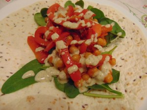 I couldn’t resist the cover photo of buffalo chickpea tacos, though we made ours as extremely messy wraps. Although it was really tasty, I felt that those chickpeas needed warming up. The sauce was delicious though, and it was another chance to use that ranch dressing.