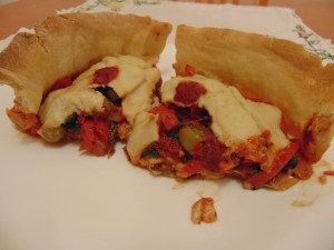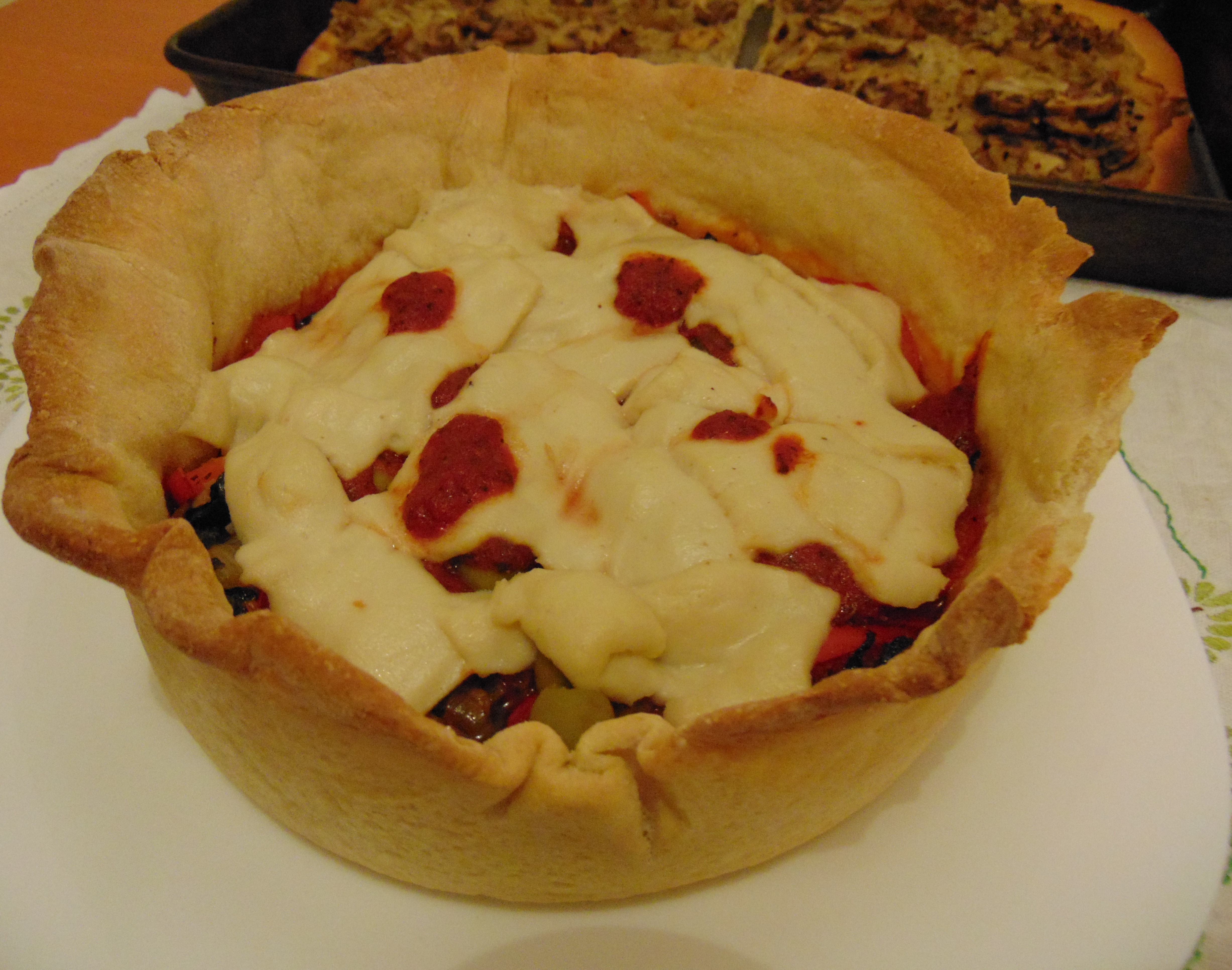 We used the same dough for the deep-dish pizza, along with the red pizza sauce and the vegan mozzarella. This was very exciting to make and had a fascinating texture. It didn’t melt as much as the pictures suggested, but it was lovely.