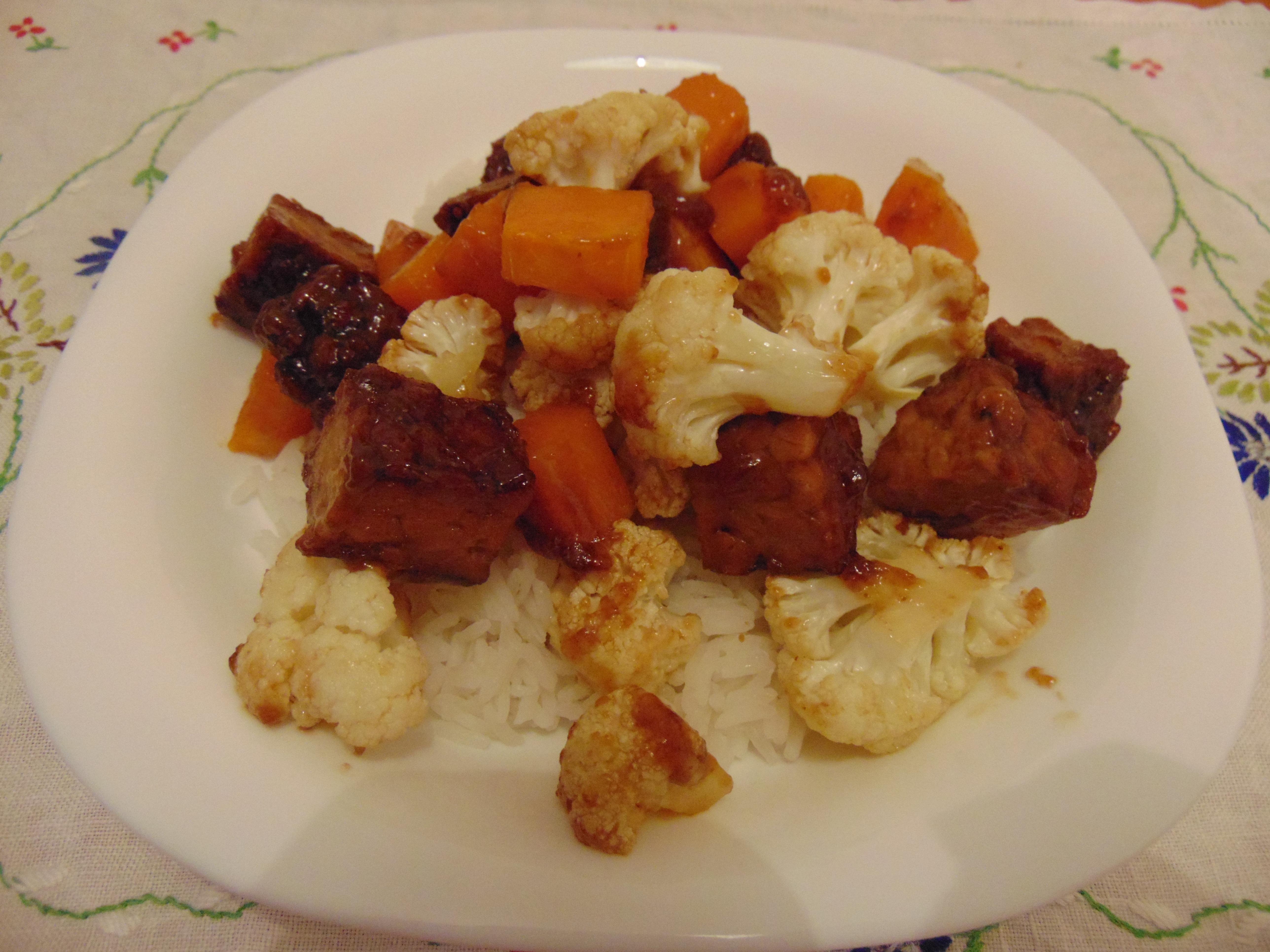 I was really excited about trying the teriyaki tempeh with butternut and cauiflower sauce, but the teriyaki sauce I made was a little thinly stretched over all the veg I roasted. This was my fault rather than the recipe’s – next time I’d probably make a double portion of sauce just to be sure I had enough. The sauce was tasty, but it didn’t come through strongly enough because there was too much veg and tempeh. Still, it was a quick, easy and pleasant meal.