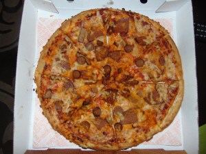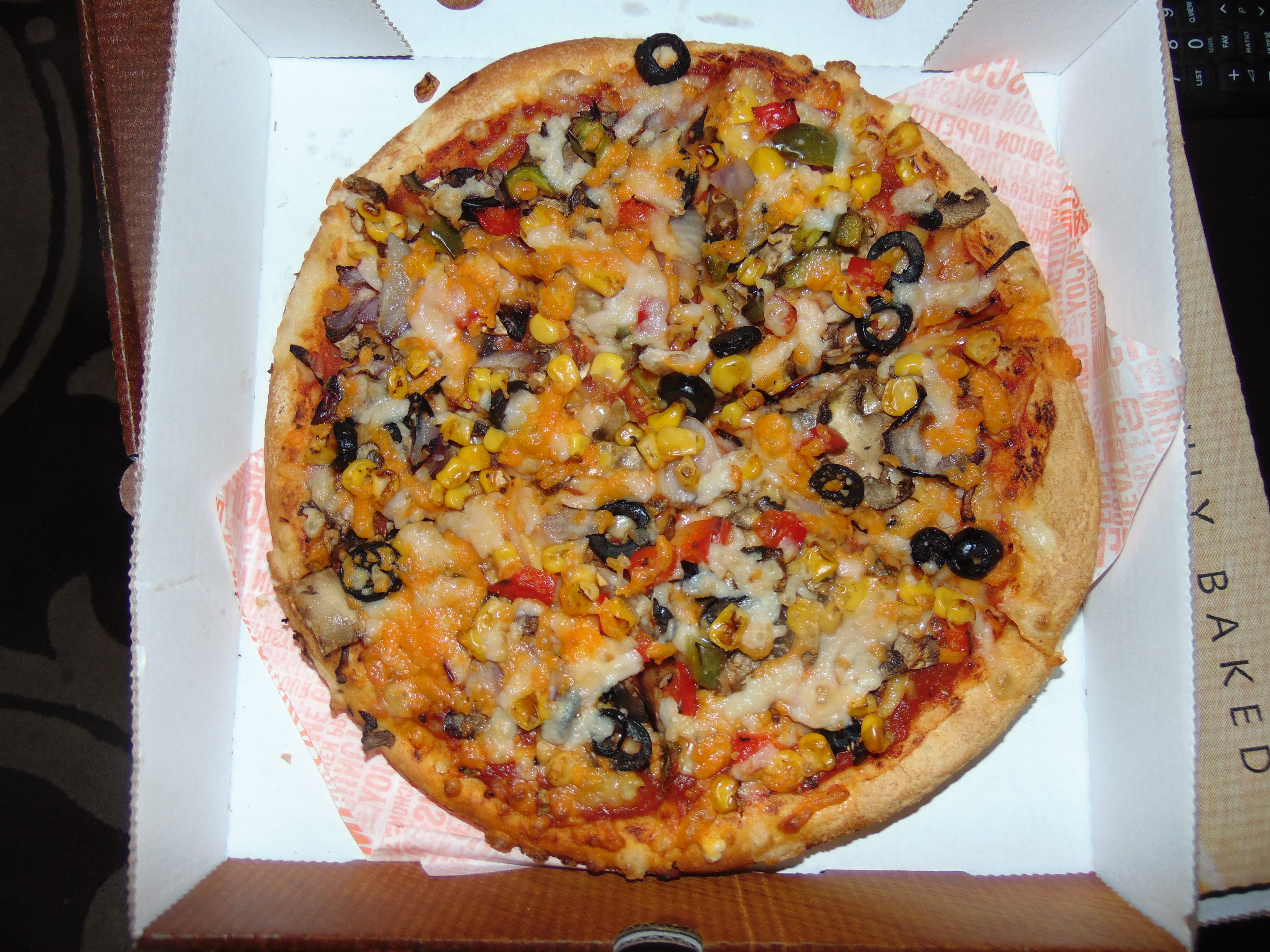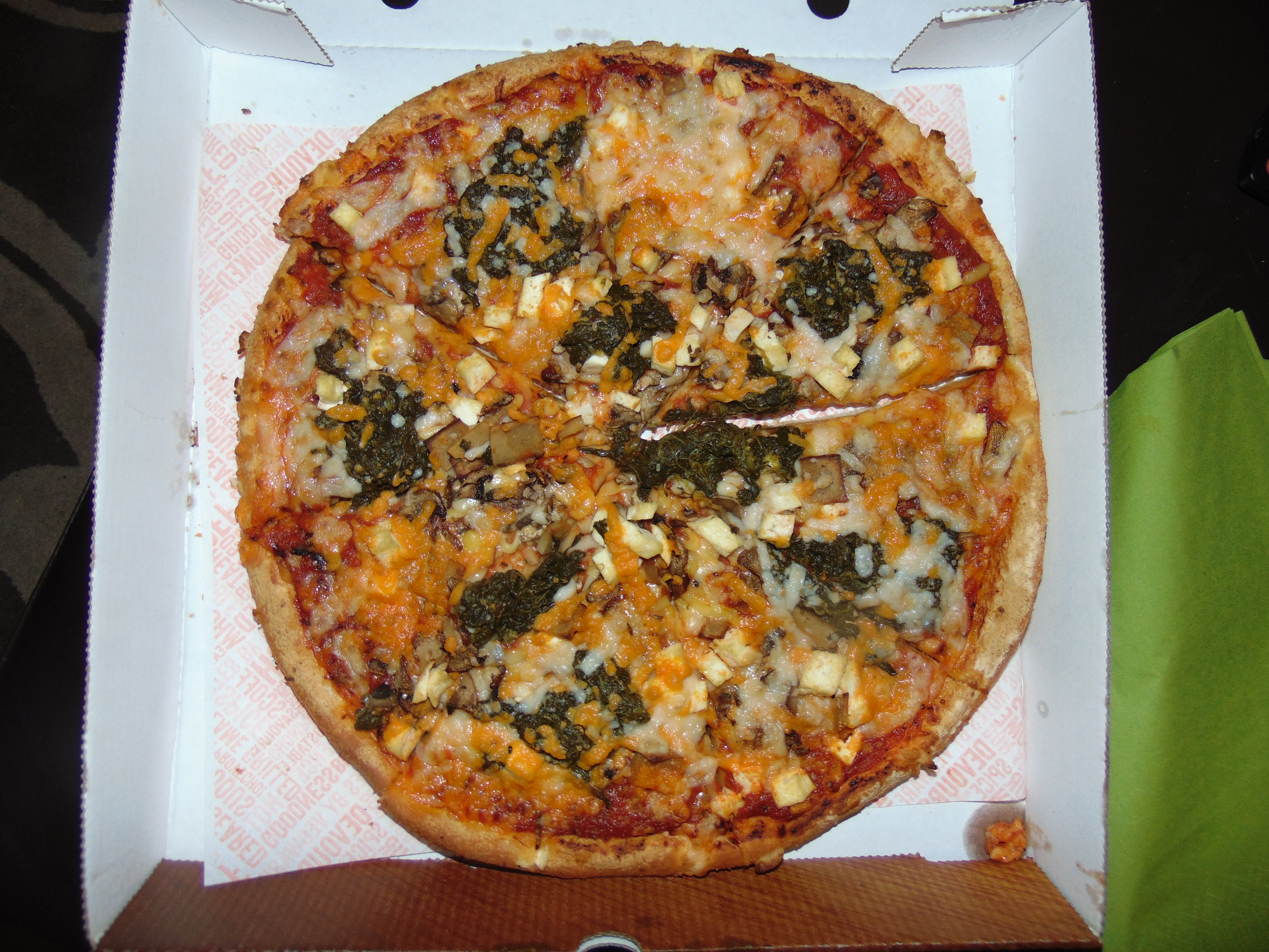 This vegangains pizza is slightly less pleasing – the mushrooms and spinach are nice, but the tofu is a bit too bland. Some of the meatier, better seasoned toppings might jazz this up a bit.