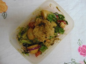 It wouldn’t be a healthy eating book without a salad section, would it? I started with the first recipe in the book: the everyday chickpea-quinoa salad, which also contains the balsamic vinaigrette and basic baked tofu. As you may have spotted, I used red quinoa, as we had a bit left in the cupboard, and it never hurts to prevent a dish from being totally beige! It wasn’t the most exciting of salads- the vinaigrette wasn’t that exciting, and we were really relying on the tofu to bring some fun and flavour to it.