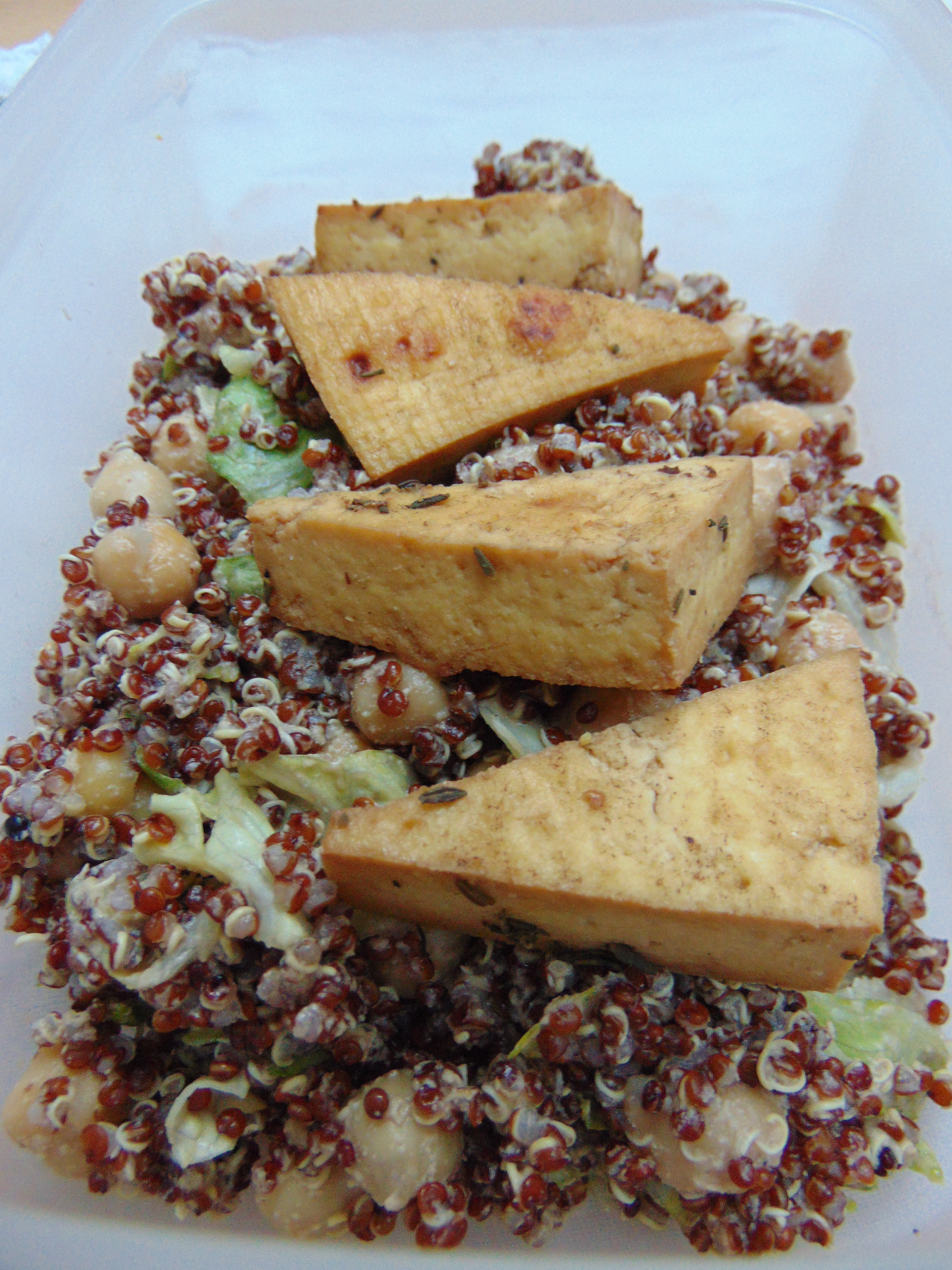 It wouldn’t be a healthy eating book without a salad section, would it? I started with the first recipe in the book: the everyday chickpea-quinoa salad, which also contains the balsamic vinaigrette and basic baked tofu. As you may have spotted, I used red quinoa, as we had a bit left in the cupboard, and it never hurts to prevent a dish from being totally beige! It wasn’t the most exciting of salads- the vinaigrette wasn’t that exciting, and we were really relying on the tofu to bring some fun and flavour to it.