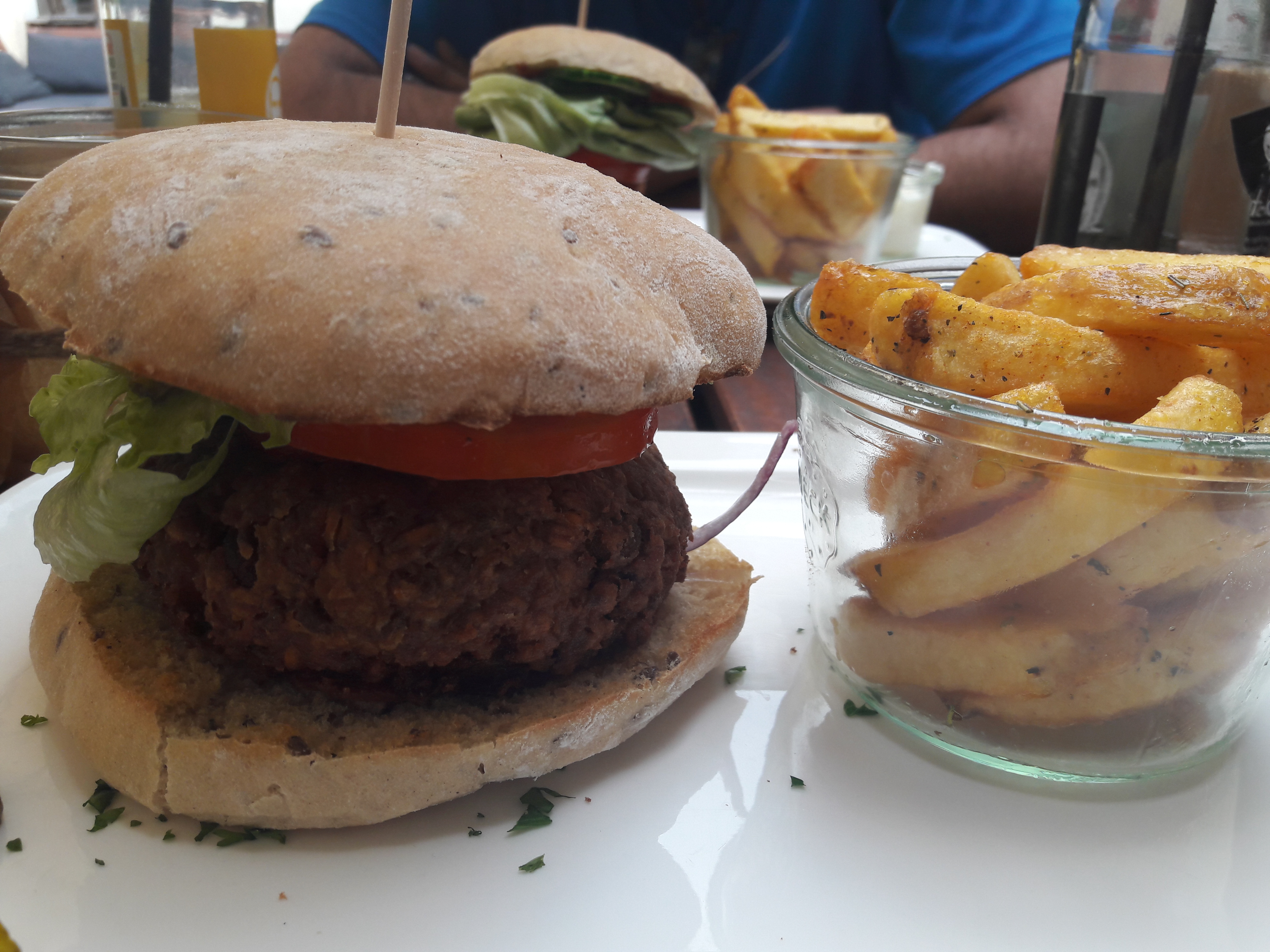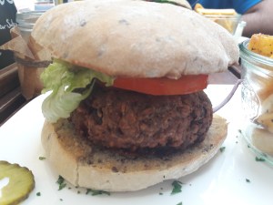 Zapfhahn is a burger place really close to the scenic centre where the bridges and pretty buildings are, so it’s ideal for a stop when you’re seeing the sights. And there’s even a nice courtyard so you can enjoy the sun while you eat! I had my heart set on their jack fruit burger, so imagine my devastation on finding that it was only available in the evening. At lunch time there was no vegan option listed, but the waiter offered me the old fashioned burger using their vegan beany patty instead. He also asked how I wanted it cooking, which must have been habit because nobody has ever asked me that before! (I went for medium.)