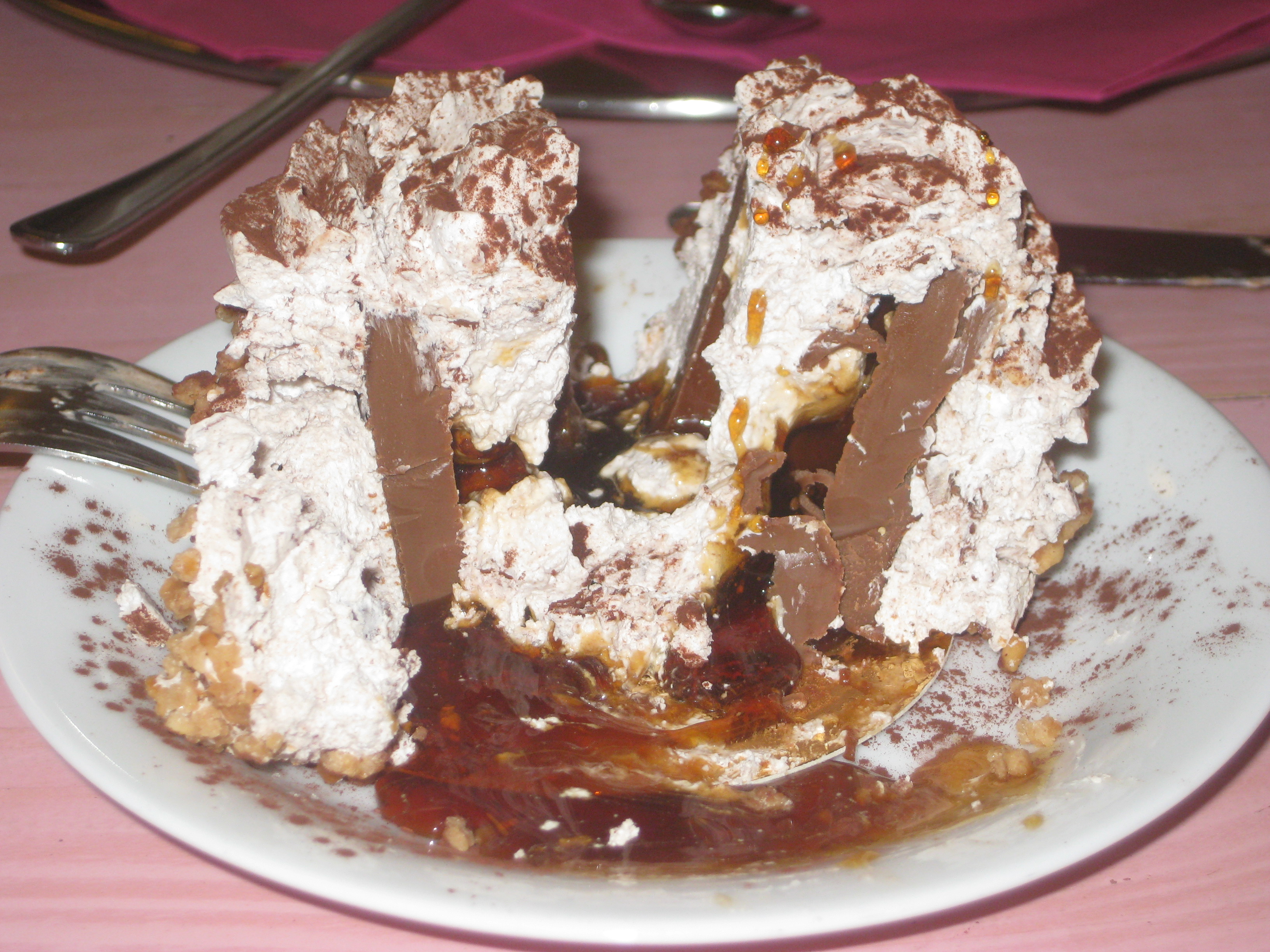 Ah, the tresor. We still reminisce about these on a weekly basis, long after this little cafe closed down. Recently in a moment of stupidity, I asked: “Did the tresor contain any sponge?” Dr HH has barely stopped laughing since. He summed up this magnificent dessert as: “A big rolo with a hazelnut in the middle,  covered in fancy cream.”