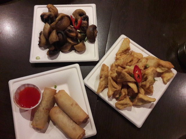 I visited with Dr HH and Mama HH, and we ordered a trio of starters to share: salt and pepper mushrooms (which were extraordinarily juicy and flavoursome), salt and pepper tofu (small, tasty, chunks of tofu that won over my tofu-hating mother), and spring rolls (pretty standard, not mind-blowing).