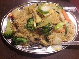 My mother invariably orders Singapore noodles when we go anywhere for Chinese. She liked this one because it wasn’t as spicy as the dish can be in other eateries, and she enjoyed all of the veg (bamboo, water chestnuts, carrot, broccoli, and onion).