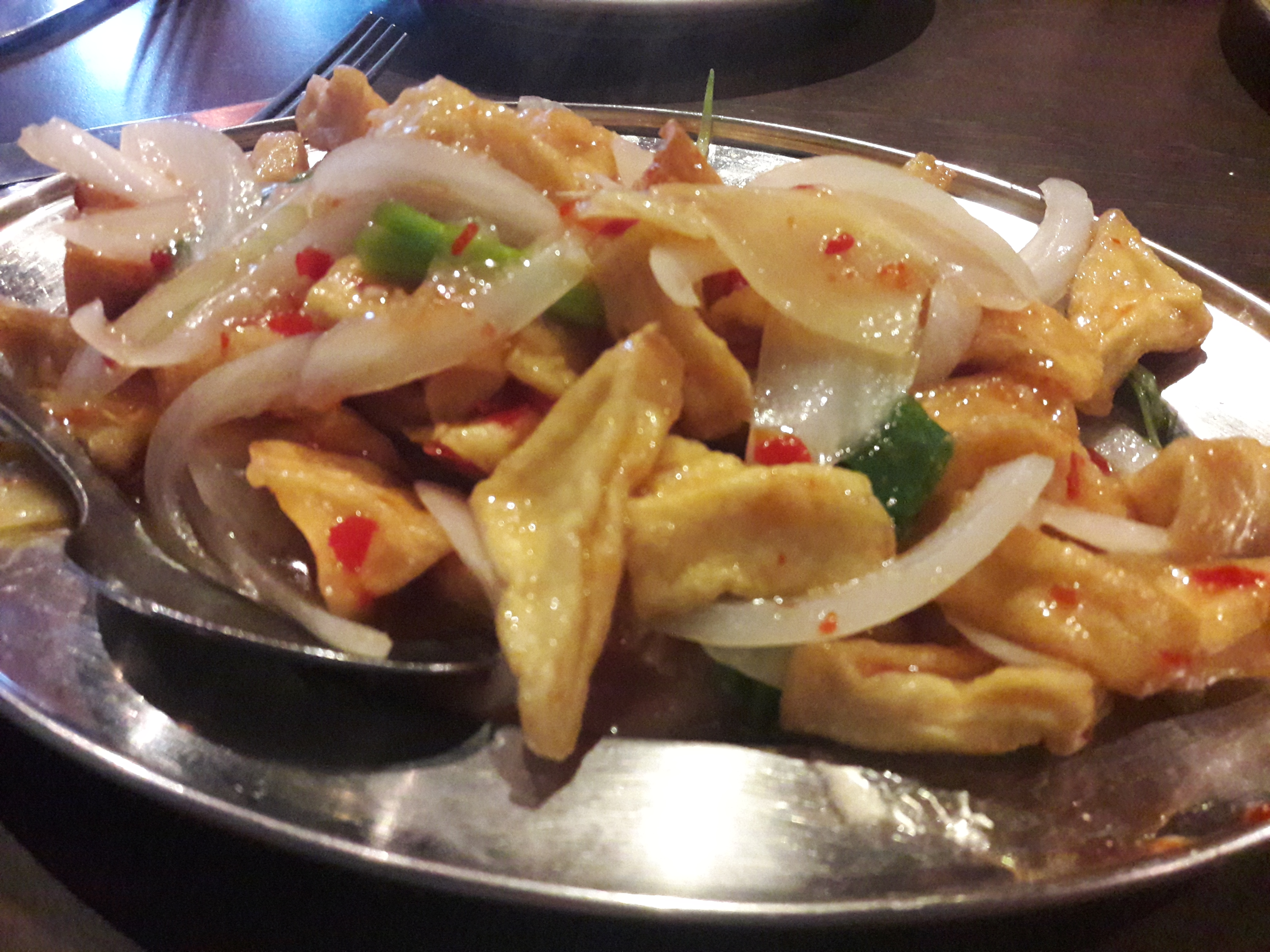You’d expect the chilli garlic tofu to be quite a potent and exciting dish, which is precisely why Dr HH ordered it. Alas, he found it not that spicy, and he needed to slurp a lot of sauce for flavour. This had the same good tofu triangles as the starter, but he found it a bit samey as a main – some other veg besides onions would livened it up.