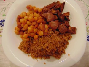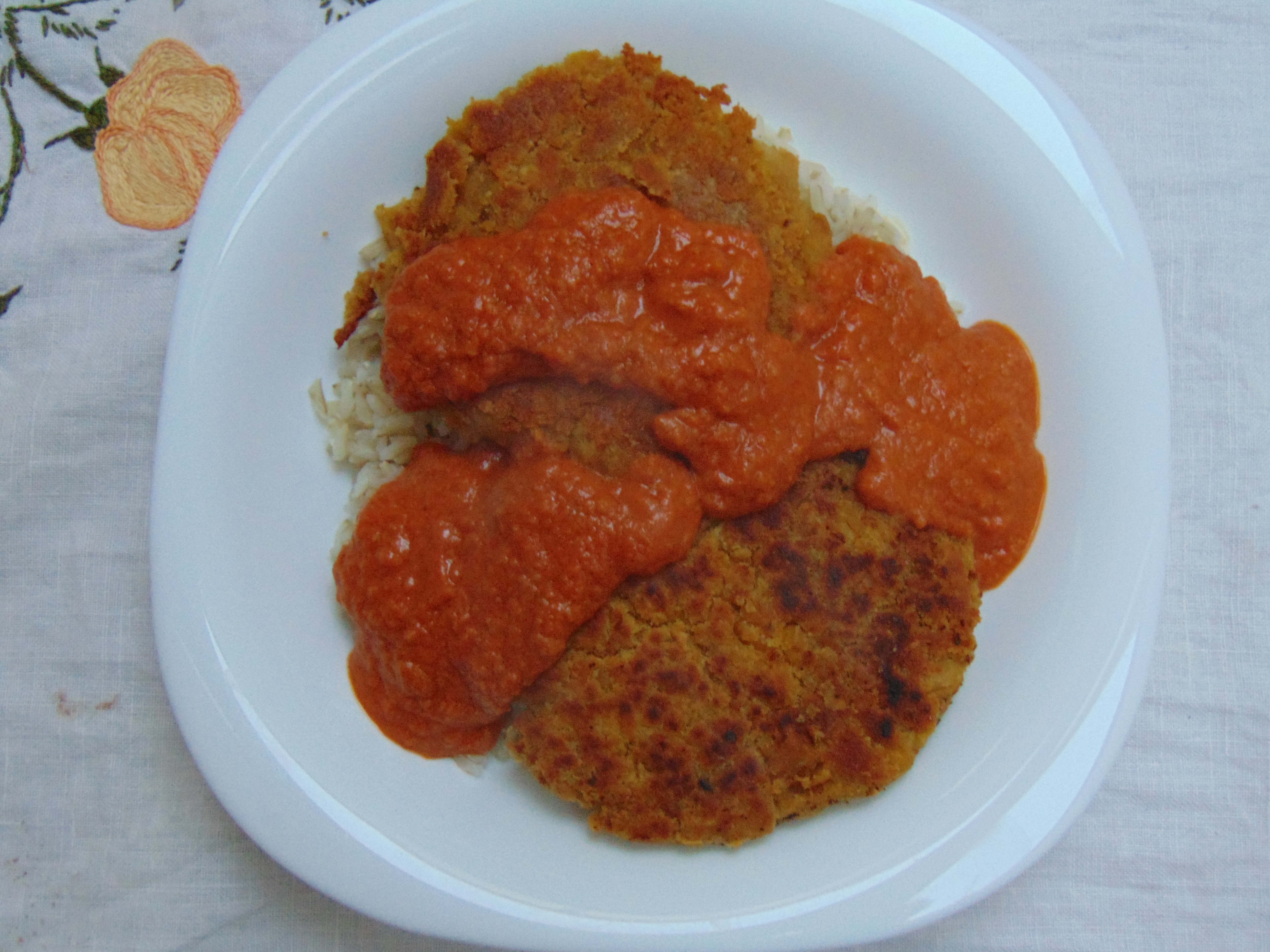 AfroVeganChick‘s day 1 post was also particularly tempting: groundnut stew with chickpea cutlets. We are perhaps the only vegans who have never made chickpea cutlets before, and I can now confirm that there’s a reason everyone is doing it. They were good! A couple of them crumbled a bit during cooking, but they were very tasty. And the sauce was spectacular, quite similar to mafe. We had leftover sauce with tempeh after we ran out of cutlets, and that was also a treat.