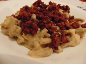 Here’s another recipe from Vegan HaHa…and another mac and cheese! The nut free creamy sauce worked an absolute treat, largely because it was very similar to the Isa recipe we love, but using beans instead of cashews for the creaminess. You can’t beat miso in a cheese sauce, that’s what I’ve found! And you can see that this time we had our bacon crumbles on hand.