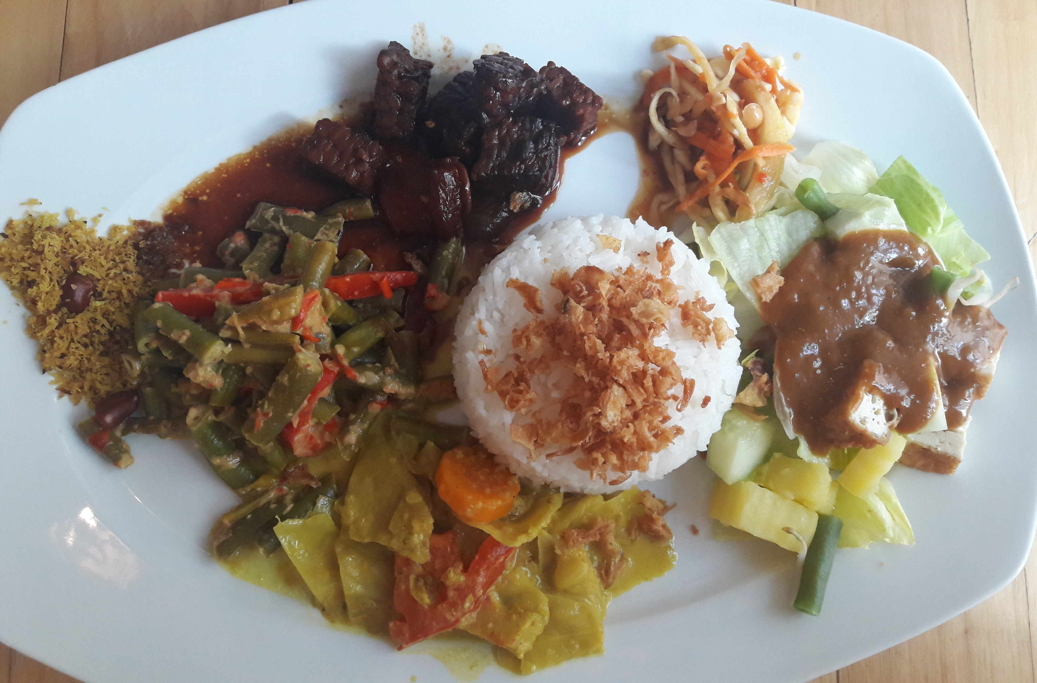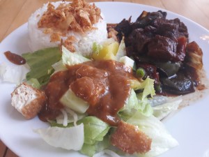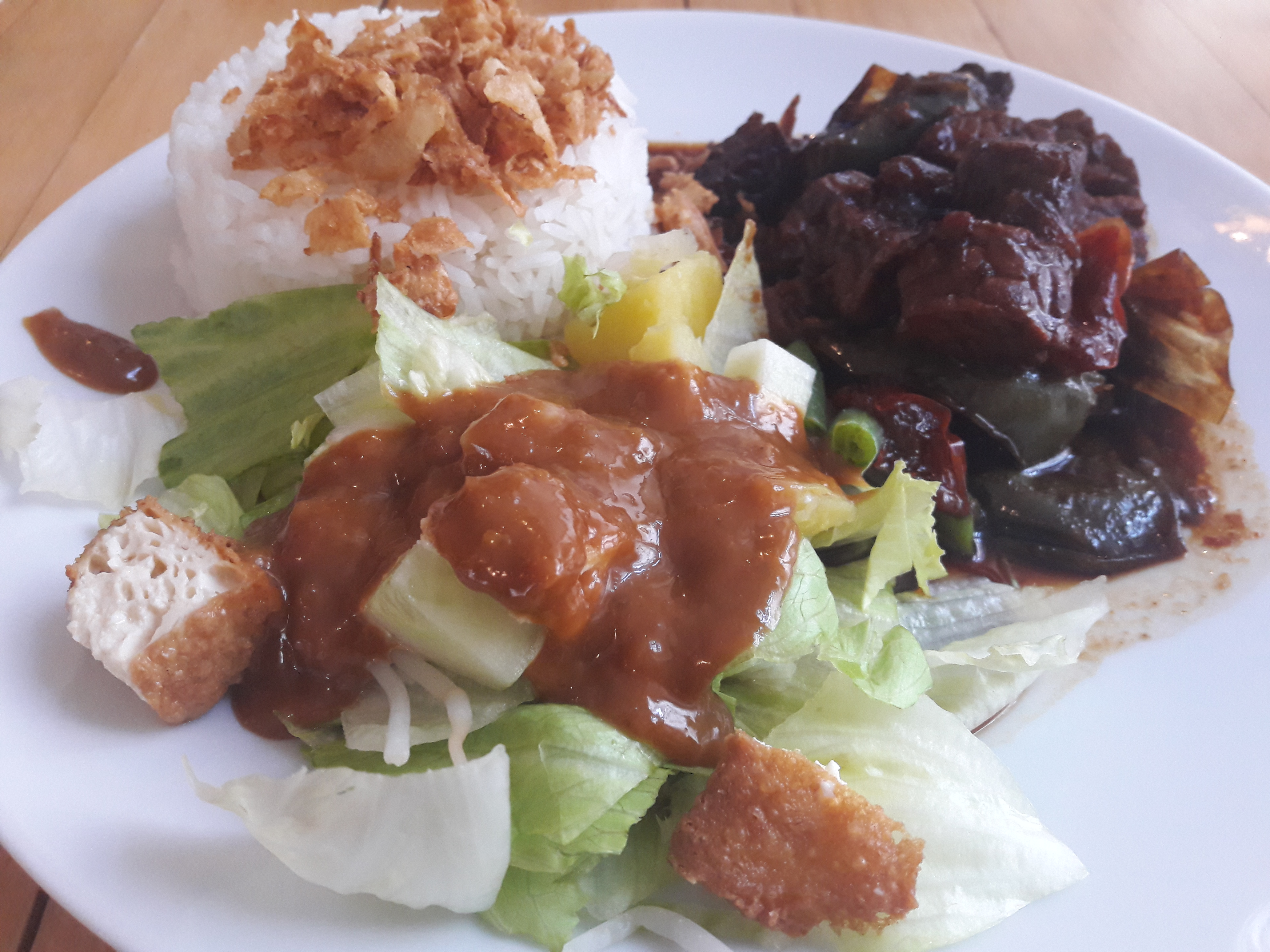 Dr HH can always be counted on to go for a mixed plate when it’s available, which is very handy for reviewing! The javanka vegan plate also featured the same tempeh, rice, and gado-gado salad.  He also had some green bean sambal goreng and some seasoned rasped coconut Serundeng, and another unspecified vegetable dish. Basically, he loved everything! The tempeh and coconut were his favourites, but everything was flavoursome and we both had clean plates at the end.