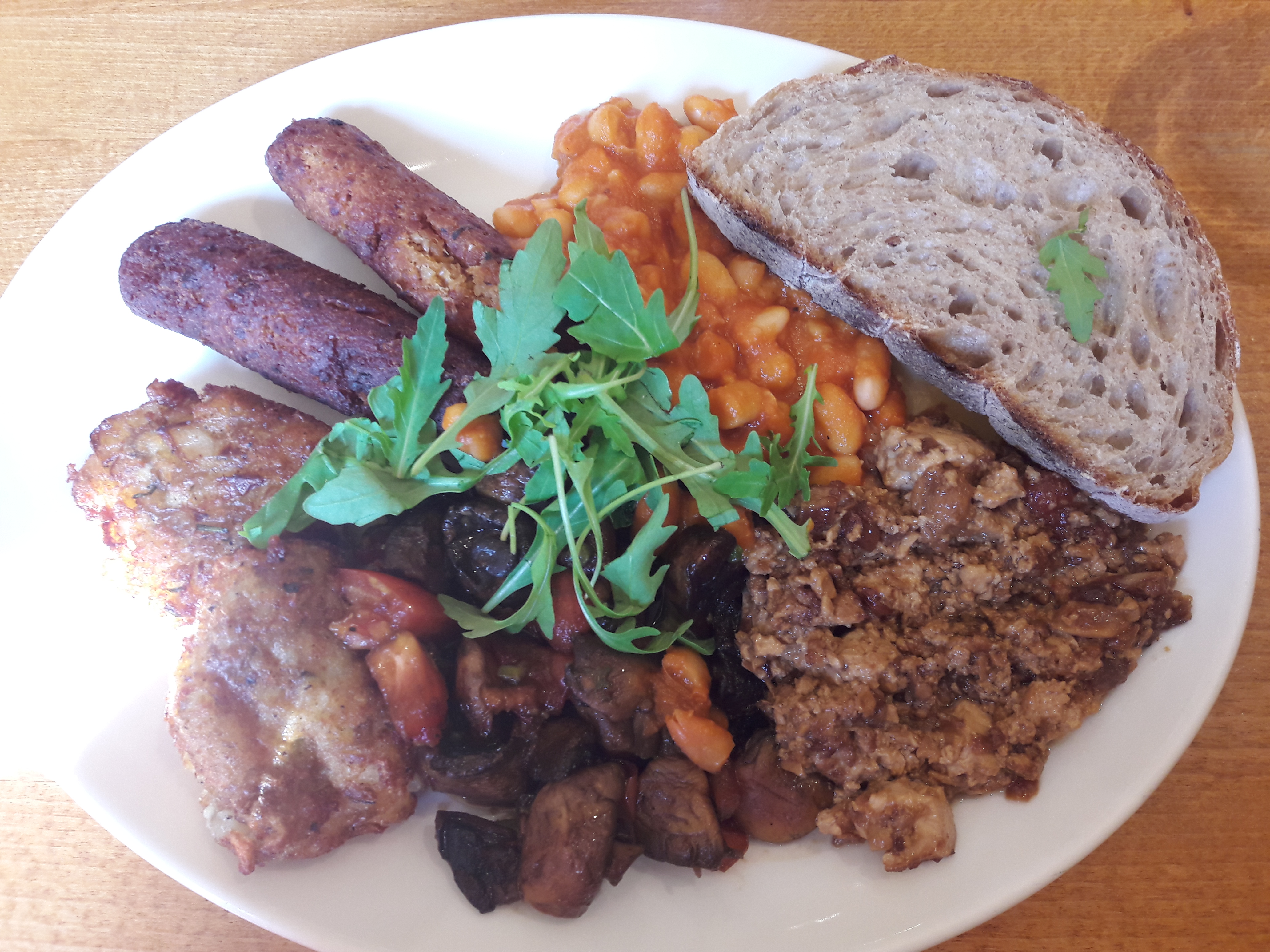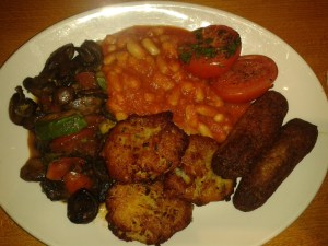 For one thing, clearing the lighting has improved! My complaints the first time around were about the tomato halves (one of my least favourite things on a breakfast plate, now mercifully removed), the sausages being a bit bland (now they’re super tasty), and there being no tofu scramble to replace the eggs that vegetarians got (and now there is a scramble!). I also grumbled about only getting one slice of toast, but this time I felt that was plenty.