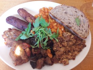 Iydea’s a lovely little veggie cafe on a charming street in Brighton full of independent shops and cafes. Just like last time, Dr HH and I both got the vegan full English, and had no regrets at all. We had a really flavoursome tofu scramble with red onions, two delicious sage sausages, two crispy hash browns, an avocado, tomato, and mushroom hash, homemade beans, toast, and a little pot of spread (not pictured). It was an absolute feast, and there wasn’t really a weak element (though I was unlucky and only got 1 piece of avo in my hash – Dr HH was good enough to even things out though). So, how does it compare to our first visit? Well…