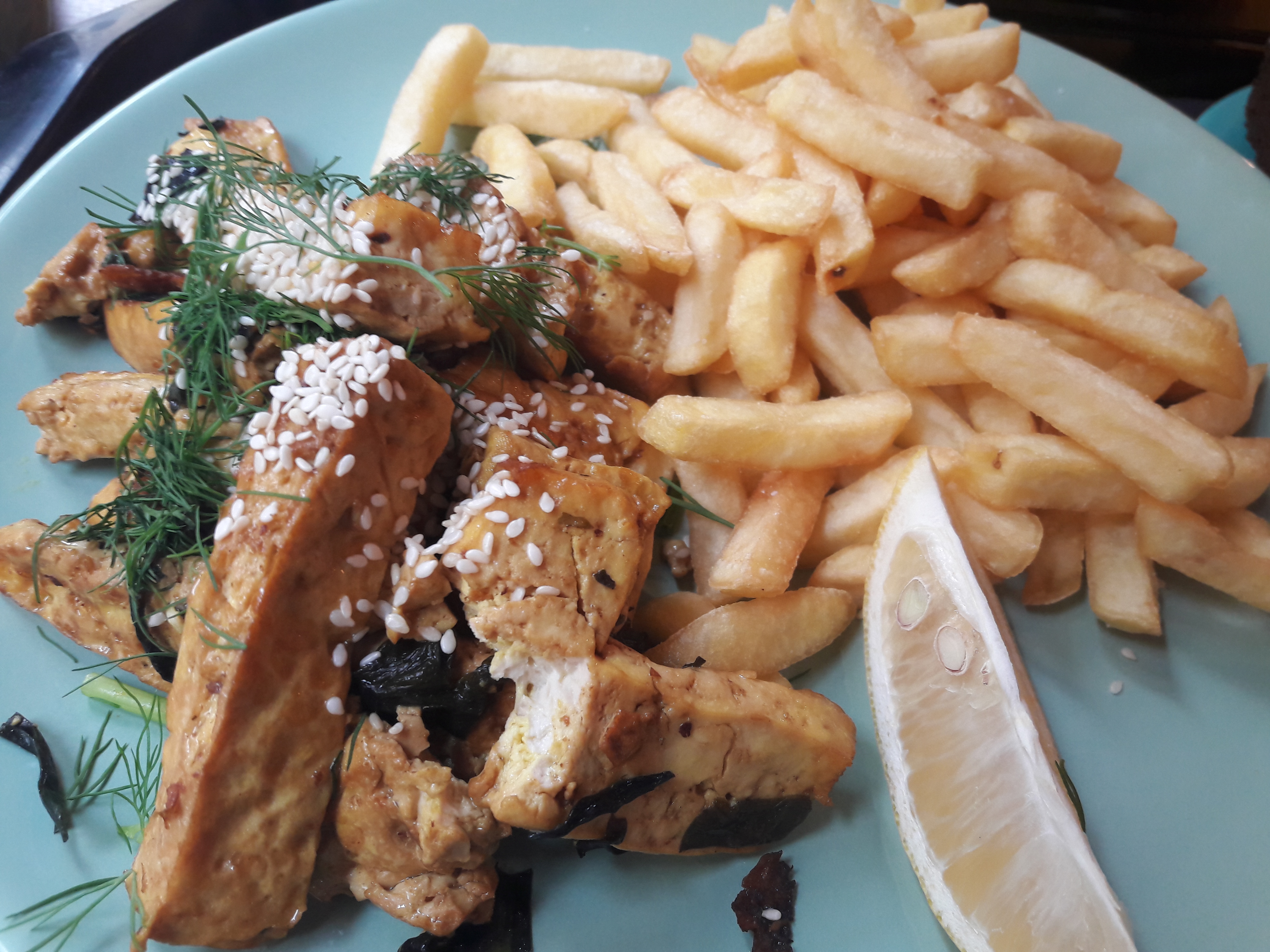 My poor eyesight led me to believe that the picture behind the counter was showing battered tofu for the fish – alas, that was not the case. The tofu was extremely nicely flavoured and it was a very delicious meal, but it was lacking a little in the texture department. The gigantic portion of chips did make up for it though, and I really enjoyed this dish.