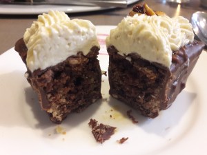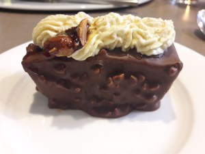 Usually I save the best till last, but I feared that philosophy would not serve me well here, given how much there was to eat. So we started with the peanut butter and chocolate cake. It was excellent! The sponge was a little dry, but it was encased in chocolate and peanuts and topped with cream and caramel, and that really elevated it. Essentially, it was a fancy Snickers bar, and I would happily eat one of these every day.