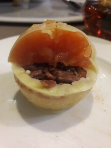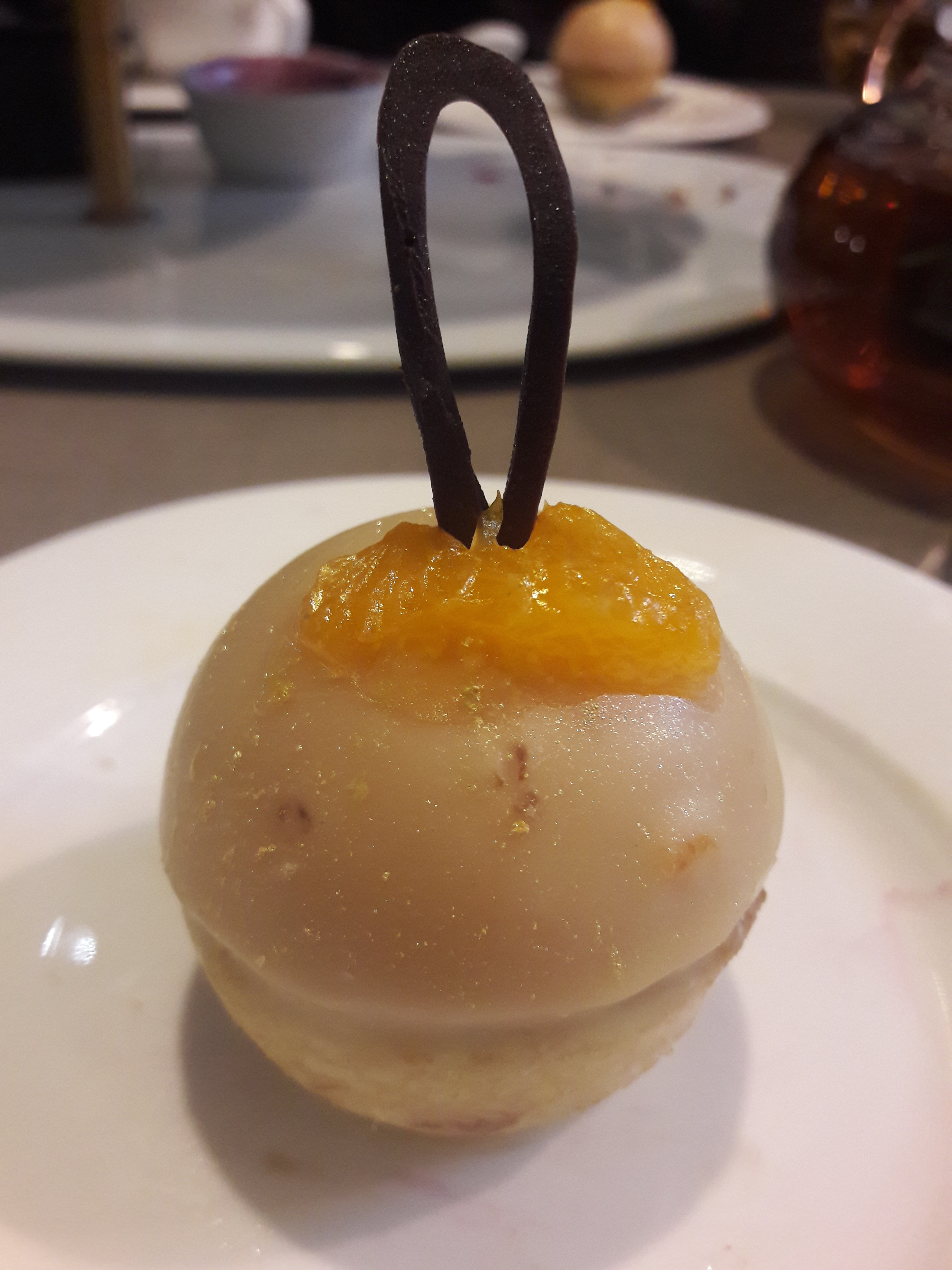 Doesn’t this Christmas bauble look amazing?! It was a great idea: sponge, a chocolatey centre, mandarin jelly, all coated in white chocolate. It was slightly let down in the execution, though – the chocolate was so hard it was impossible to cut through it, meaning that it wasn’t possible to eat all the different elements together. The jelly was a little too sharp without the sweetness of the chocolate to balance it out, so it didn’t quite fit together as it should, but it was still a very ambitious and exciting dessert.