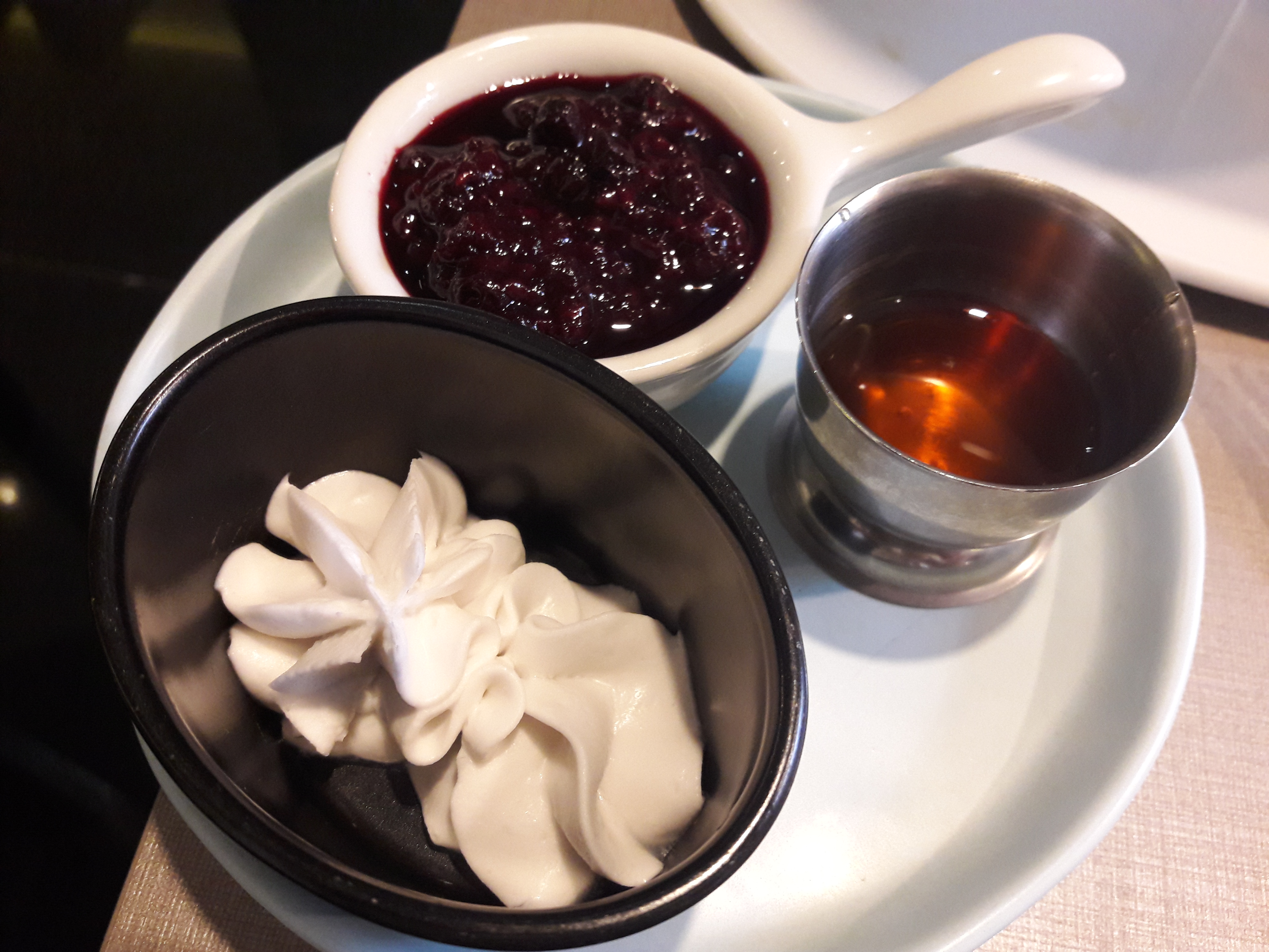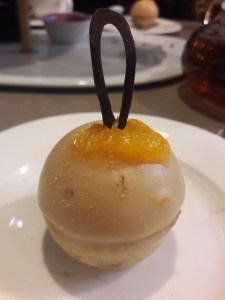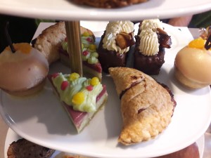 And then on to the scone plate. It’s never the most exciting part of an afternoon tea, but La Suite West tried to make it a bit fancier by serving some vegan honey alongside the coconut cream and jam. I did not actually try the honey because I’m extremely traditional and am not sure about honey with scones. Regular readers will not be surprised to learn that Dr HH was all over it though, and he reported that it was very close to honey in both taste and texture. The cream was nice, but there was nowhere near enough of it for the four scones. The jam was really good – thick and fruity. We got two fruit and two plain scones, but only ate the fruity ones because it seems foolish to fill up on scones when there are more exciting dessert options awaiting (and I was already starting to feel full). The scones were solid, then, but were never going to be the highlight.