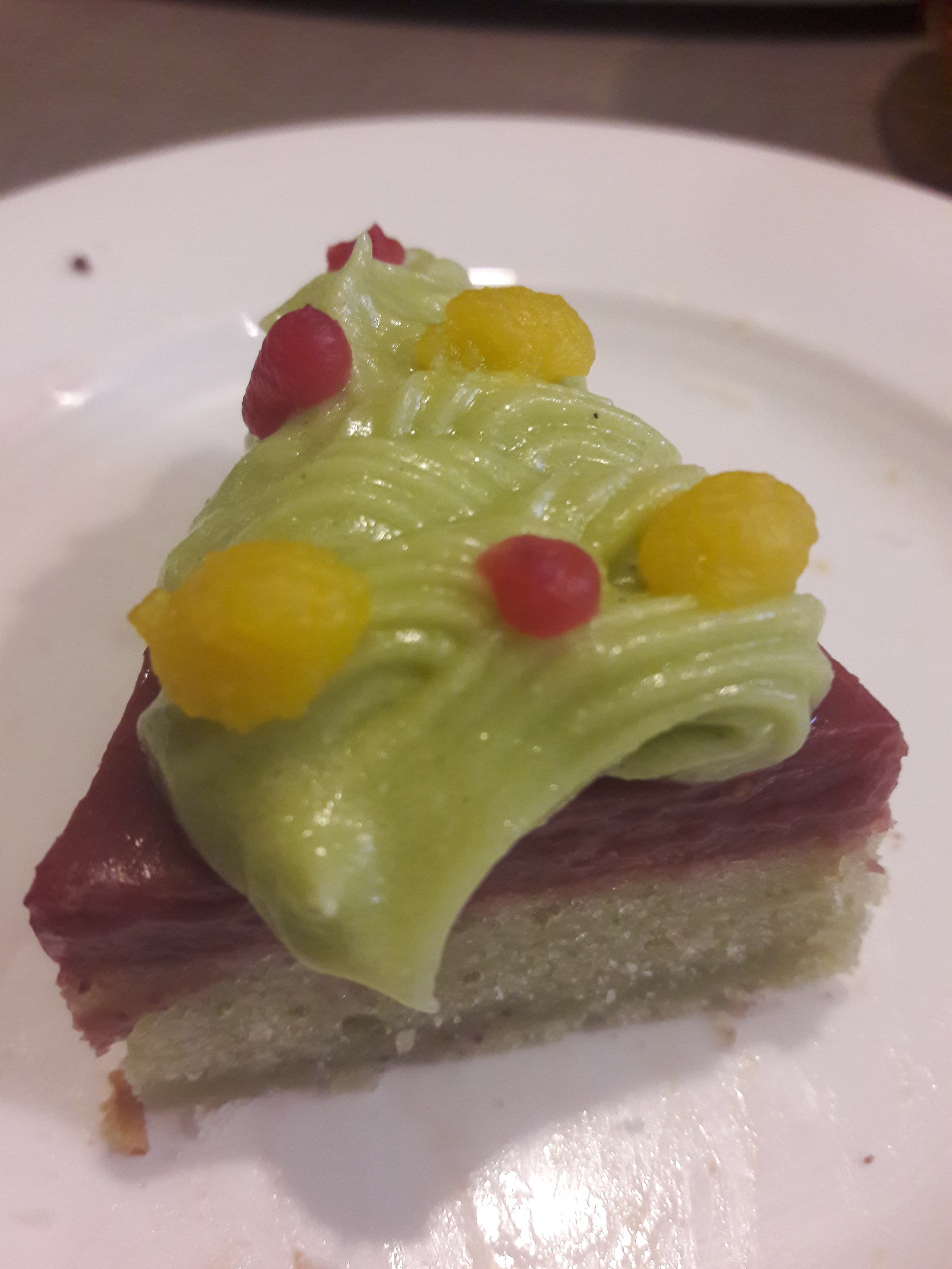 At this point, I gave up: I just didn’t have room for another bite. Dr HH pressed on though, and tried the last two desserts. The Christmas tree cake looked lovely, but he was quite underwhelmed by it – it tasted quite strongly of marzipan, and the sponge was once again a little dry. He also tried the apple and pear pie, which looked like a little pasty – alas, the pastry lacked any degree of crispness, and there was barely any filling in it.